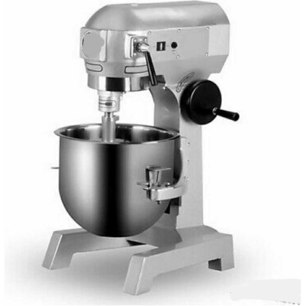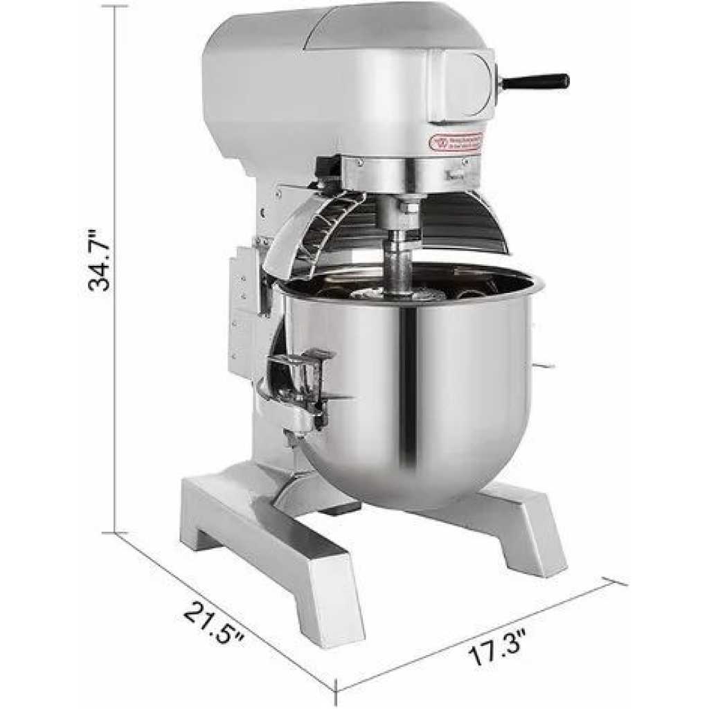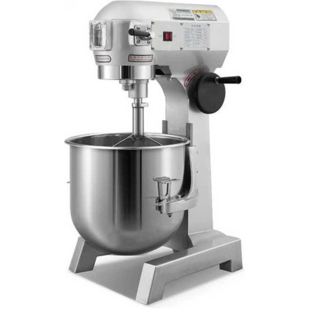 30L Commercial Adjustable Electric Food Dough Stand Mixer Maker Grinder For Kitchen – Silver 3 Rotation Speeds & Detachable to Clean & with 3 Stirrers Our stand mixer has a 20Qt bowl for mixing a large number of food at one time. The food-grade stainless steel mixing parts are sturdy and durable to use. It adopts a powerful motor with 3 adjustable speeds. Three mixing stirrers are equipped for versatile use. Besides, it’s easy to operate with detachable parts, the adjustable bowl height and a security guard. This food mixer is ideal for cooking enthusiasts. 30Qt Mixing Bowl The 20Qt large bowl can mix max. 6.6 lbs / 3 kg dough at one time. The mixing parts are all made of food-grade stainless steel with a neat appearance. With this premium material, easy cleaning, and rust & corrosion-proof, it is durable and sturdy to use. 3 Adjustable Speeds The 750-watt high-performance motor ensures stable operation, providing three adjustable mixing speeds (105 RPM/180 RPM/408 RPM) to help you efficiently mix your food. 3 Stirrers Included This stand mixer has three replaceable attachments, including a spiral dough hook, a flat beater, and a wire whip. They are perfectly designed for you to do all types of food mixing.3 Adjustable Speeds Security Guard The secure shield can avoid accidental injuries. It will also keep the ingredients from splashing while showing you the inside situation. With the automatic shutdown function, this machine will stop immediately once the shield is opened or not closed tightly. Effortless to Use & Clean The detachable design is convenient for you to clean the components. A turning wheel is equipped for adjusting the bowl height, which can perfectly adapt to various mixing requirements. The rubber feet of the machine can increase stability Various Applications It’s widely used in restaurants, hotels, pizzerias, bakeries, commercial kitchens, etc. Perfect for all your food mixing needs, including creaming, mixing, beating, whipping, and kneading. Incredibly suitable for making pizza dough, bread dough, cake batter, etc. Specifications 1 x Commercial Mixer 1 x Dough Hook 1 x Flat Beater 1 x Wire Whip Power: 750W Bowl Volume: 30 Qt Mixing Speed: 105 r/min, 180 r/min, 408 r/min Max. Kneading Capacity: 6.6 lbs / 3 kg Product Dimensions: 16.5 x 20.5 x 30 inch / 42 x 52 x 76 cm Product Weight: 138.9 lbs / 63 kg