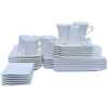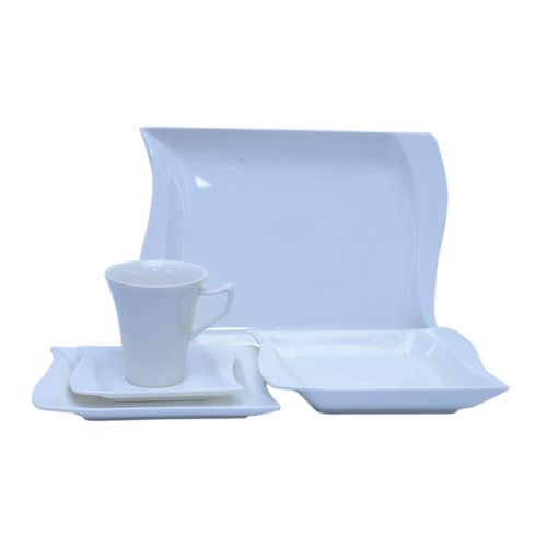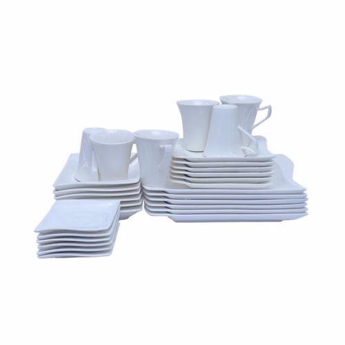 30pcs Ceramic Dinner set -White Enjoy your meals on this lovely shaped set with dinner plates, side plates which are used for serving break fast, bowls which are used for both sauce and cereals. It includes:6pcs Dinner Plates6pcs Side Plates6pcs Soup Plates6pcs Tea cups6pcs Cup saucers.Material. Ceramic