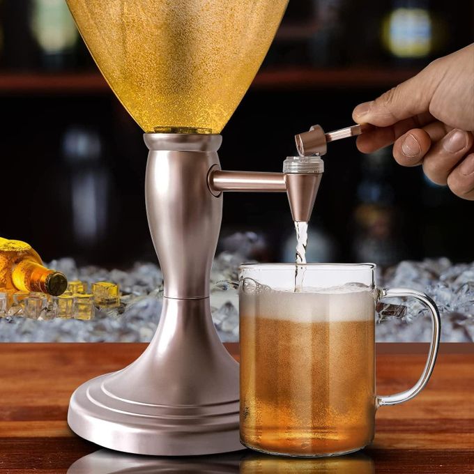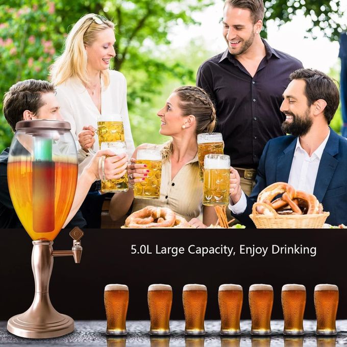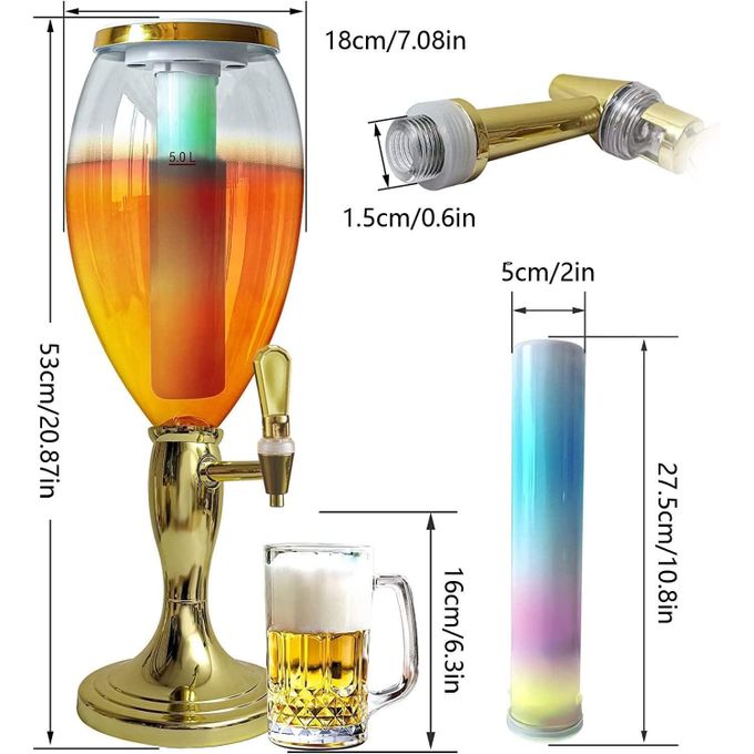 3L Beer Tower Dispenser, Tabletop Beer Tower with LED Lights,Tap And Removable Freeze Ice Tube, Durable Beverage Tower Dispenser Perfect for Party Home Bar Family Buffet Restaurant UNIQUE GIFT FOR BREW ENTHUSIASTS: The Beer Tower is the perfect gift for any brew enthusiast. Makes a great gift and souvenir for all festive and non-festive occasions such as birthdays, anniversaries,Gameday, party, Father’s Day, Christmas, New year, Thanksgiving, Halloween, and more! it’s a beer accessory that will always stand out. Name: 5L Beer Tower Drink Dispenser w/Tap, Freeze Tube, Led Light To Keep Beverages Ice Cold Large Beverage Tower Dispenser for Bar Family Buffet Restaurant FEATURES. Transparent Container Removable Ice Tube Steel core faucet Steady Flow LED Lights 【PREMIUM STURDY BASE】Our weighted, solid plastic base ensures that your beer tower will never tip while dispensing drinks. There are several rubber bumps on the bottom to increase the beer dispenser friction with the countertop. It locks when twist and is easily removable for cleaning. 【EXTRA LARGE CAPACITY】The capacity of this beverage tower dispenser is 5L/5.3 Qt, about 170 oz. Enough for a whole party night. There is a removable ice tube inside it for ice cubes.On party night, turn on the colorful LED lights of the beer tower, enjoy the cold fresh beers, which will bring you a different experience. 【WITH SPIGOT AND STAND】The liquid flows out at an appropriate speed, neither too fast to splash on clothes nor too slow to wait for a long time. The nozzle of the tap is made of metal to resist corrosion.It can be dispense cold beer, cocktail, whiskey, soda, fruit juice, margarita, champagne, etc