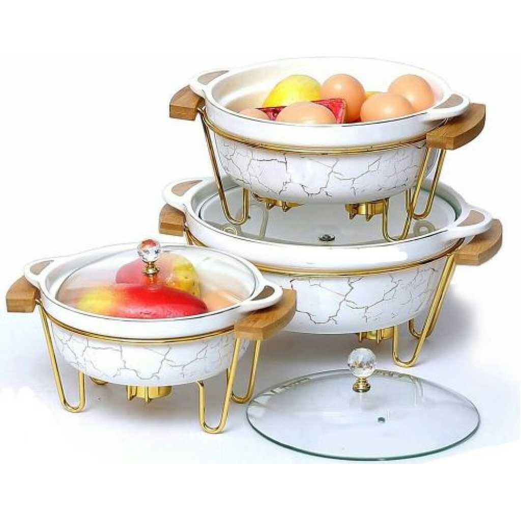 3pcs Ceramic Food Warmer Chafing Dish Casseroles For Food Service – Multi-colour. 3pcs Ceramic Food Warmer Chafing Dish For Food Service is the best when you are having events, weddings, birthday parties, or guests at your house or normal family dinners. With a considerable rectangular design, 3pcs Ceramic Food Warmer Chafing Dish For Food Service is strong durable, and 100% food safe. The stainless steel chafer also has the ability to hold the lid in an upright position while food in the full-size chafer pan is being served. 3pcs Ceramic Food Warmer Chafing Dish For Food Service has a smooth, ceramic surface and sturdy glass lids with handles. This warmer comes with a supporting leg, as well as a candle holder to ensure that the food or soup is kept warm as it is served. 3pcs Ceramic Food Warmer Chafing Dish For Food Service maintains your food temperature and is perfect for buffet serving and other situations where you want to keep food warm for extended periods of time. The well-contoured handle offers a comfortable grip. Tea light candles provide heat to keep food at proper serving temperatures. 3pcs Ceramic Food Warmer Chafing Dish For Food Service resists stains and hence is easy to clean. 3pcs Ceramic Food Warmer Chafing Dish For Food Service has a cool-to-the-touch handle. The chafing dishes are easy to clean and take up less space on your kitchen counter or table space. This amazing 3pcs Ceramic Food Warmer Chafing Dish For Food Service Key Features: 3pcs Ceramic Food Warmer Chafing Dish Casseroles For Food Service. Tea light candles provide heat to keep food at proper serving temperatures. Resists stains and hence is easy to clean. The well-wooden handle offers a comfortable grip. Bowl material: Ceramic. Stainless steel support legs. Food Warmer well-contoured handle offers a comfortable grip. For Food Service. An elegant design can serve as a perfect gift.