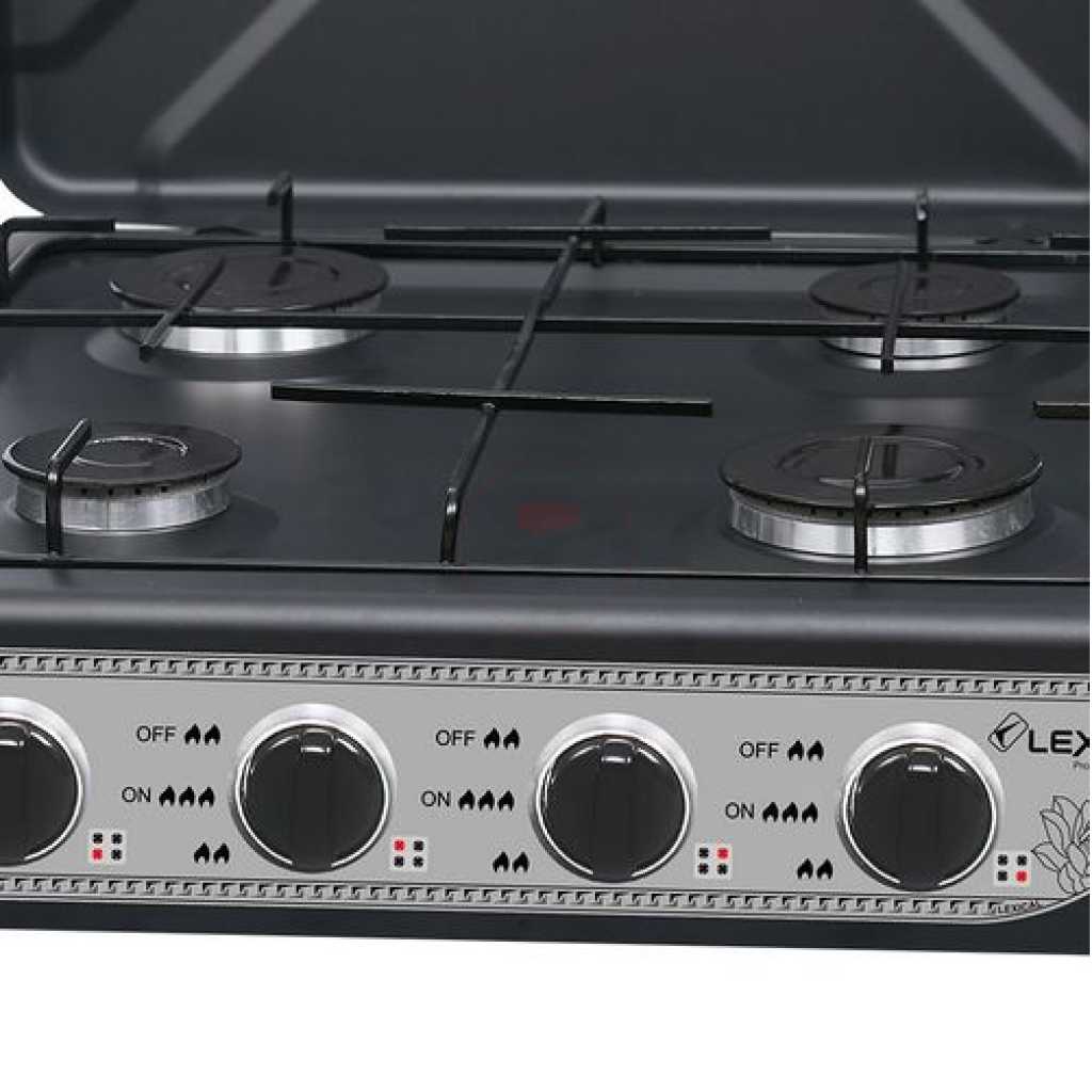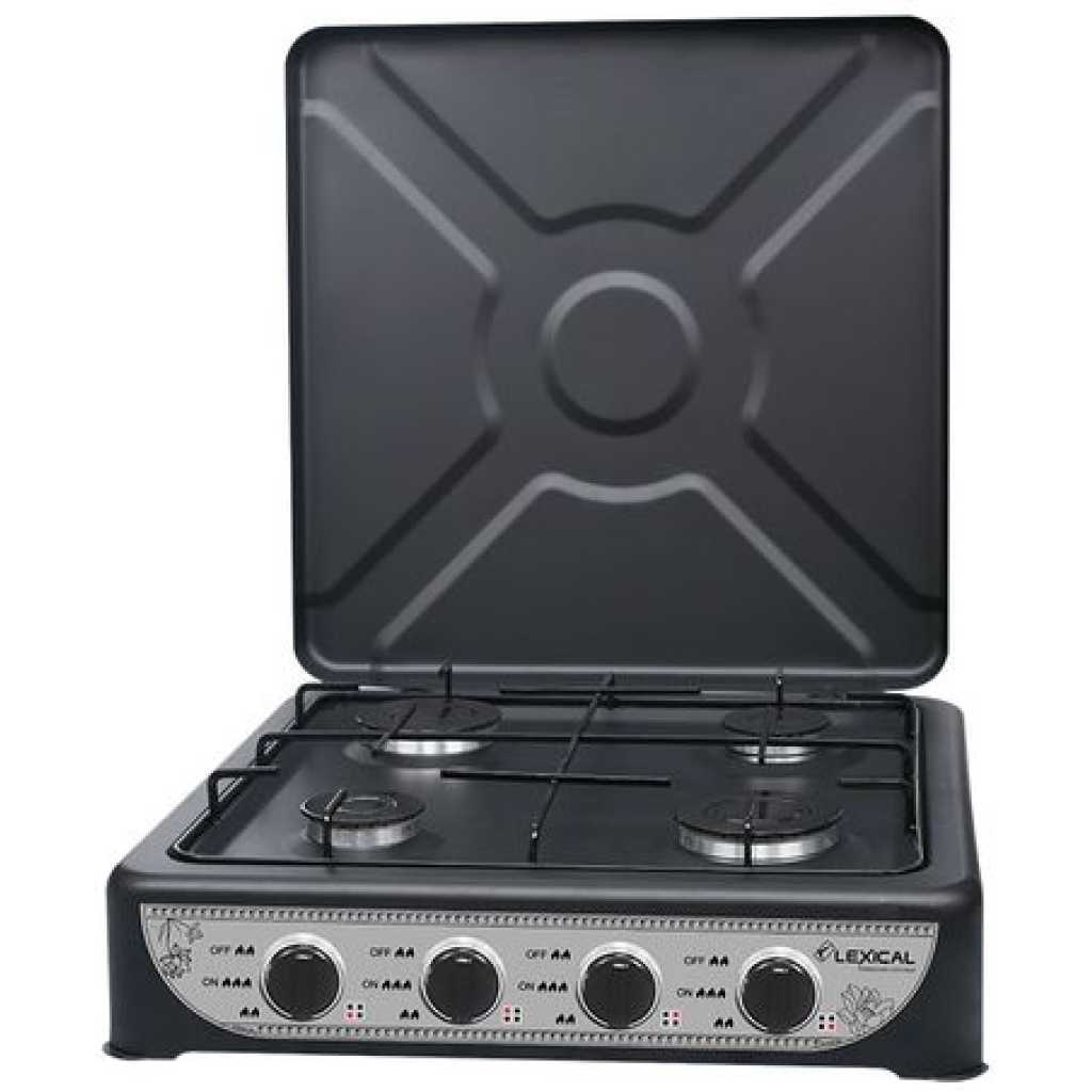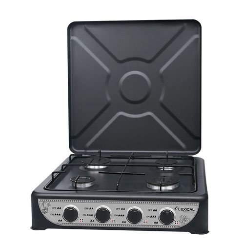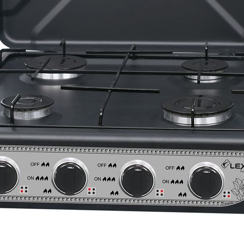 4 Burner Gas Cooker Stove With Lid -Black. Our portable gas stove is a great choice for your outdoor kitchen, when you are going camping, or even when you just want to cook something easily and quickly. The temperature can be adjusted at the push of a button. This device is equipped with a stainless steel burner, and a removable grill and lid. Ideal for camping, temporary arrangements, camper, and outdoor cooking. This hob connects easily to a bottle of butane or propane gas. Good performance with fully adjustable burners. Removable enamel pan supports for easy cleaning. Cover shields burners from wind for maximum heat. Key Features: 4 Burner Gas Cooker Stove With Lid -Black. Cooker Type: Gas Cooker Number of Burners: 4 Adjustable Knobs Easy Setup Compact and Stylish. Color : Black Big burner size Enamel pan support Knob for gas regulation Gas connection Easy to clean & use