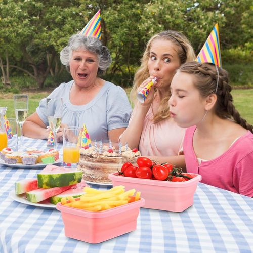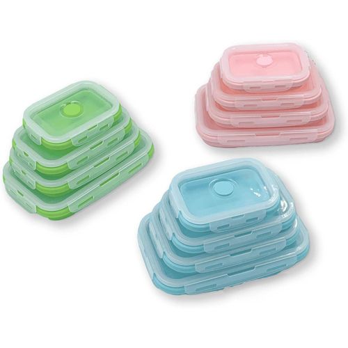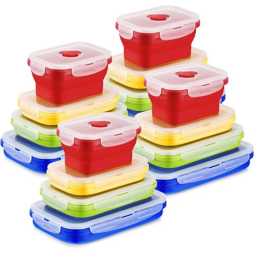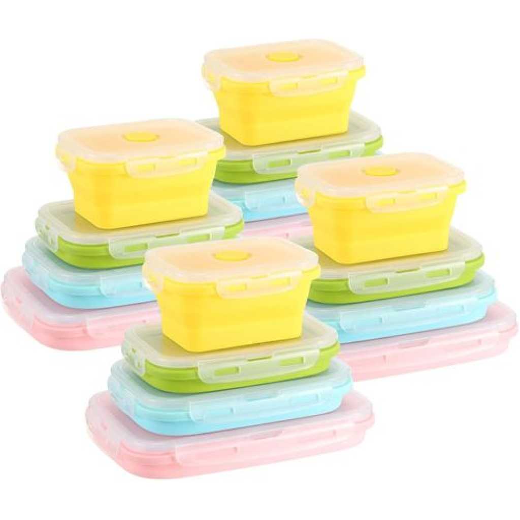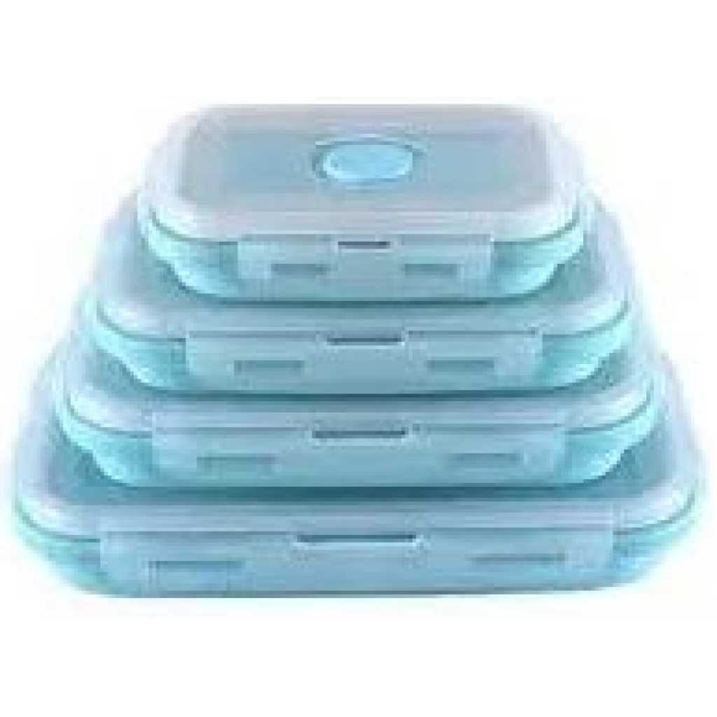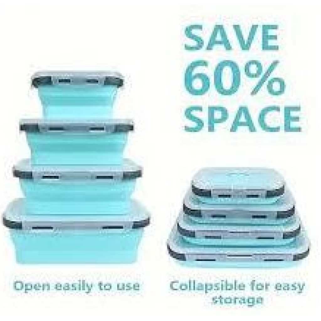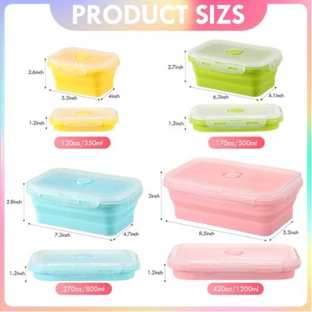 Key Features: 4 Pack Silicon Lunch Box Flat Stacks Collapsible Food Storage Containers With Lids. [Foldable Food Containers] A set of 4 silicone foldable containers is suitable for different needs and individuals. You can use the small size (400ml) for daily healthy snacks, the medium size (600ml) for leftovers, the large size (800ml), and the extra-large size (1200ml) for sandwiches, salads, leftovers, or anything you desire. [Save Space, Perfect for Daily Use] The collapsible design reduces the size by over 50% when not in use. The silicone food bowls can be folded to 60% of their original height for maximum organization. Whether in the kitchen, camping, or on RV trips, they fit perfectly in your kitchen cabinet, backpack, or suitcase! The sealable lid keeps your food fresh, and the vent is perfect for convenient microwave heating. [High-Quality Safe Materials] The food storage containers are made of food-grade silicone that is BPA-free, non-toxic, odorless, non-stick, and easy to clean. The silicone lunch box has better temperature resistance, ranging from -20°C to 230°C. [Convenient to Carry] Compared to old-fashioned bulky glass containers, silicone is lightweight and easy to carry. Using reusable leftover containers instead of disposable plastic lunch boxes helps protect our planet.