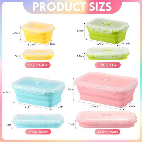 4 Pack Silicon Lunch Box Flat Stacks Collapsible Food Storage Containers With Lids. Rich Amount to Meet Your Use Demands: you will get 4 sets of silicone food storage containers, each set has 4 pieces in 4 sizes, 16 pieces in total, a sufficient quantity that can meet your various use demands and sharing needs easily Different Sizes for Multiple Uses: our silicon storage food container is available in 4 sizes, they are 12.3 oz/ 350 ml, 17.6 oz/ 500 ml, 28.2 oz/ 800 ml, and 42.2 oz/ 1200 ml, you can use the 350 ml one for your daily healthy snacks, the 500 ml one for your children’s meals, and the 800 ml and 1200 ml ones for yourself or your significant other, bringing a nice using experience for you Use with Confidence: our collapsible food storage containers are formed by quality silicone, have no bad smell, not easy to break or deform, the smooth surfaces are easy to wash, microwave, dishwasher, and freezer safe, and the temperature resistance range is subzero 20 degrees Celsius to 220 degrees Celsius, strong enough to accompany you for a long time under normal use Collapsible Design to Save Space: the silicone freezer containers can be collapsible into small pieces for easy storage when you are not in use, which can be folded down to 1/3 of their original size, saving a lot of space in your kitchen, ideal for small apartments, dormitories, motor homes, camping and more Extensive Scope of Use: our stackable silicone containers have a nice design and are practical, you can use them for many indoor or outdoor activities, such as work, camping, hiking, travel, school apartments, dorms, hospitals, road trips, classrooms, and more, which will bring a lot of convenience for you