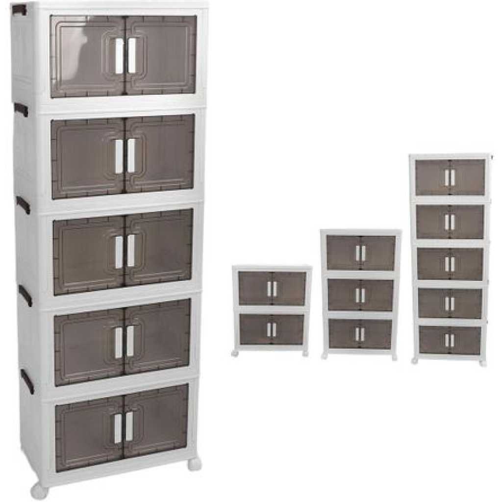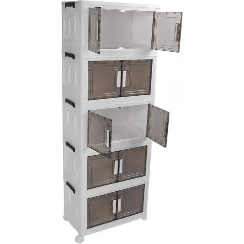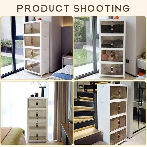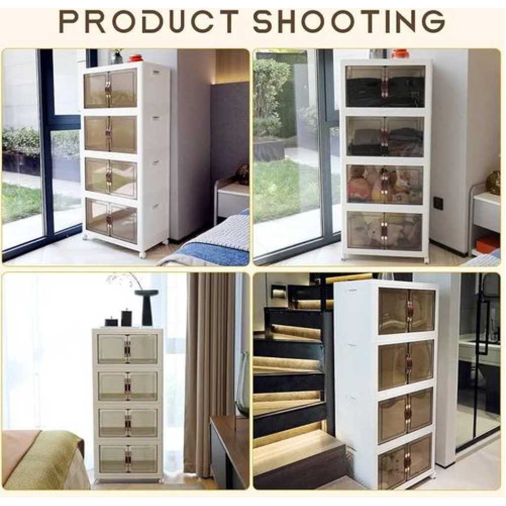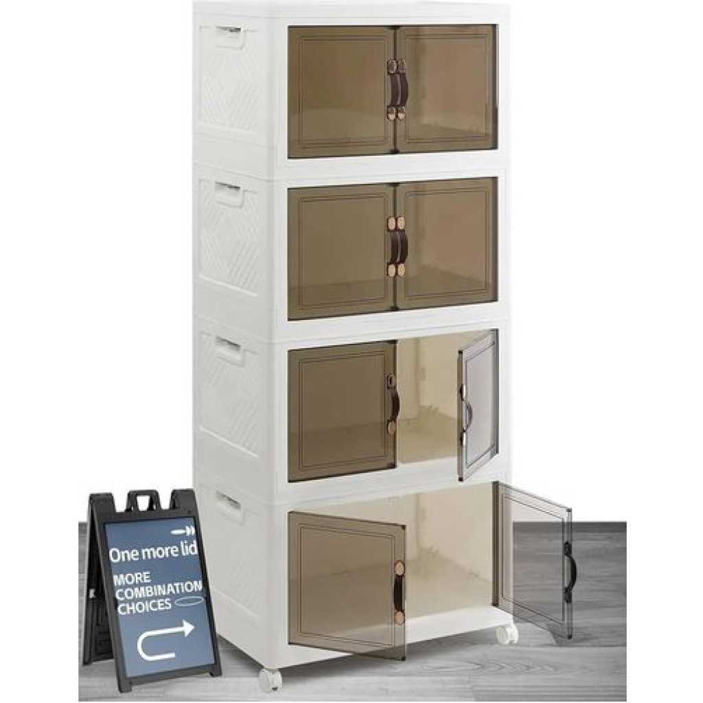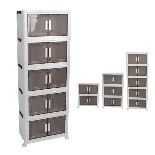 Key Features: Foldable and Easy Assembly: This storage bin can be folded flat when not in use, and assembly is a breeze, no need to keep instructions for reassembly or use tools. It takes just about 10 seconds to quickly piece together the components in a simple manner. Versatile Storage Solution: Ideal for organizing toys, crafts, photos, medications, snacks, and more. It is also a convenient storage space for garages, classrooms, closets, kitchens, bedrooms, bathrooms, offices, or food storage areas as an additional option. Double Door Design for Convenience: Featuring a double door design and comfortable handle, this storage container is easy to access and store items. The transparent design offers great visibility, making it easy to locate desired items while combining aesthetics and practicality. Easy Mobility with Wheels: The bottom of the folding storage bin features 4 wheels for effortless movement, and 2 wheels are equipped with buckles to secure them , preventing any unwanted shifting. PP PET Materials for Durability: Made of premium PP and PET, this storage cabinet is sturdy when assembled and can also be individually detached for separate use. The superior materials ensure a longer lifespan, strong weight bearing capacity, and reliable performance.