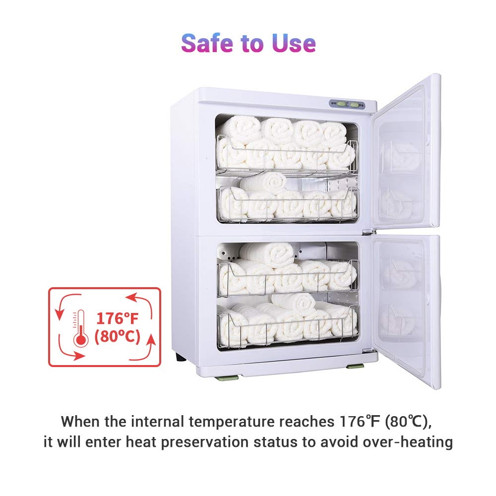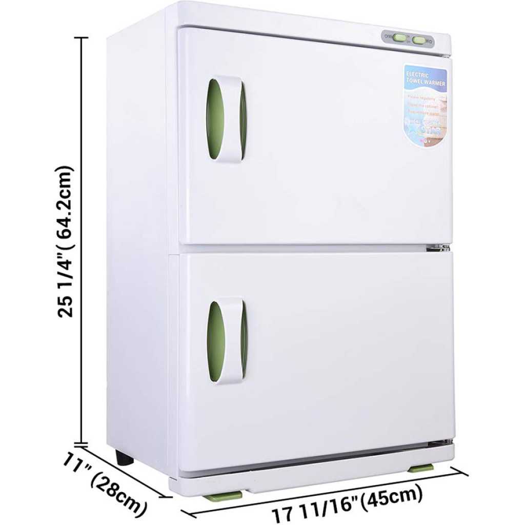 Key Features: CE approved towel warmer, 46L extra large capacity for placing 100-110pcs towels! (Reference towel size:26-4/5″L x 12-1/5″W) Dual cabinet stainless steel inner chamber for better heat conduction, no infection Micro computer temperature control system for preventing over-heat, Average 158℉ Upper and lower shelves to easily & orderly store towels, removable tray underneath to avoid dripping Thoroughly and evenly warms both traditional and disposable towels, not only suitabe for warming towels but also neck warmers and massage stones