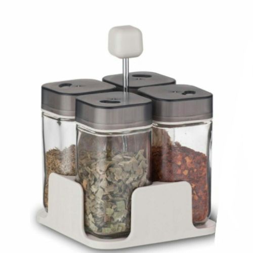 Key Features: Three tired spice storage rack. Holds 4 adjustable spice jars in and neat. Lazy susan 360 degree revolving design. Each jar has a stainless steel. super smooth rotating action and a gourmet look and feel. Jars are dishwasher safe and refillable.