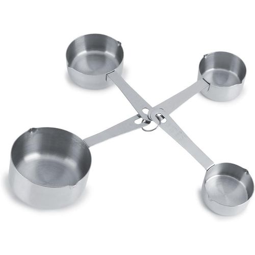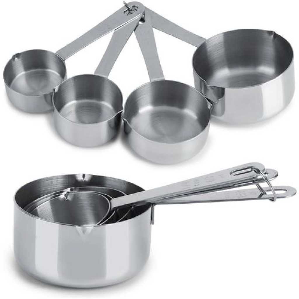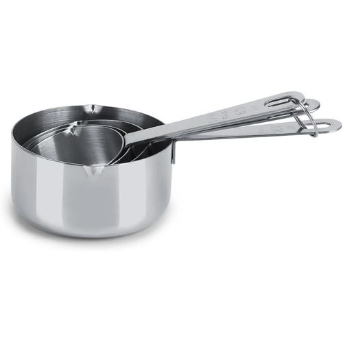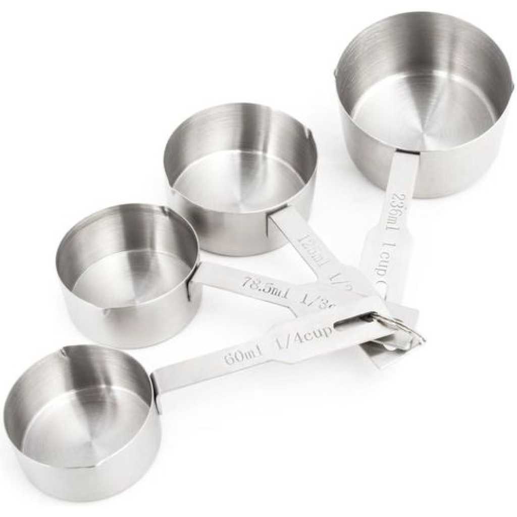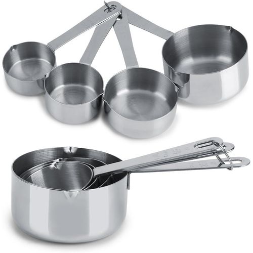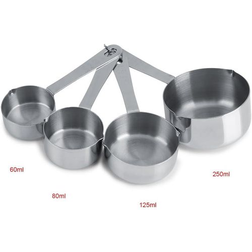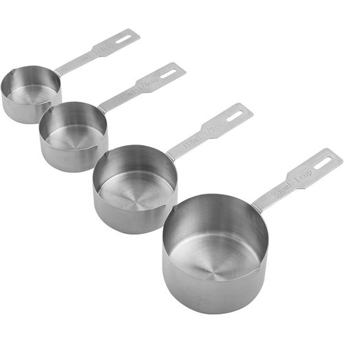 Key Features: Made of food grade 430 stainless steel material, it’s anti rust, non toxic, safe to use, easy to clean, dishwasher safe and durable in using A set of four measuring cups which includes: 1/4-cup, 1/3-cup, 1/2-cup and 1-cup, different capacity for various requests Multi-functional measuring cup which can measure dry and liquid material such as sauce, rice, powder and etc Engineered for precision accuracy to assure consistency in food preparation, easily holding handle Set nests for convenient storage and attach them to a removable loop after a full day of baking or cooking