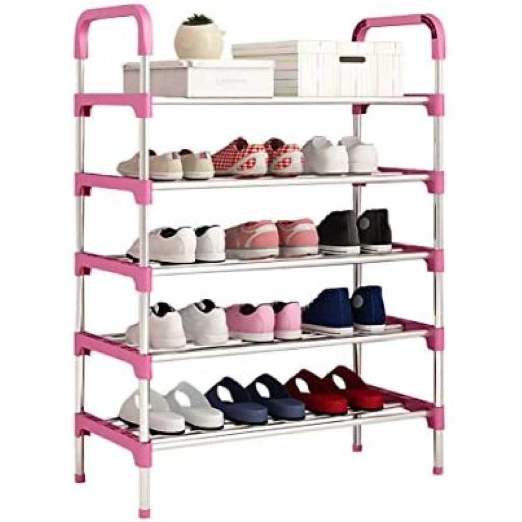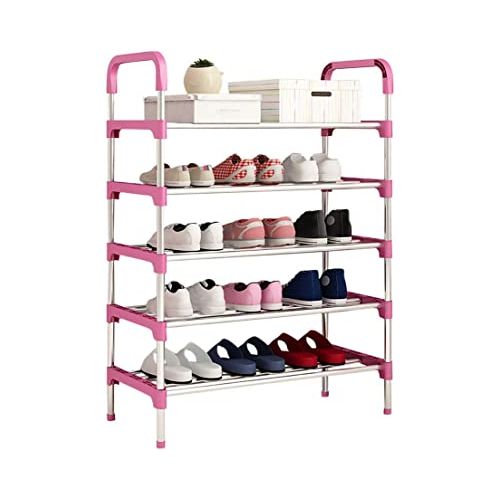 Key Features: 5 Layer Stainless Steel Stackable Shoes Rack Organizer Storage Stand- Pink. 【Easy to assemble and Convenience】 Although the shoe rack is relatively light in weight, but stable. It is easy to assemble and comes with a carefully structured instruction manual, you don’t need any experience or special tools. 【High Quality Material】The shoe rack is assembled from steel pipe and PP plastic connectors. The surface of the steel pipe is smooth and wear-resistant, and the plastic connectors are stable too. 【Size and Large Capacity】23.6 in x 11.8 in x 43 in(L x W x H).The shoe rack with 6 layers. It can place 21 pairs of woman’s shoes (3 pairs/layer) or 18 pairs of man’s sneakers (2 pairs/layer, it depends on your shoe size) 【Selected Design and Function】Because each layer’s height is 17 cm, so the spaces between tiers can accommodate different types of the shoes, such as high heels, casual shoes, sports shoes, etc. And it also can be a locker to store gloves, blankets, clothes, etc. It is adjustable too, simply remove a tier or 2 to put away boots or other larger accessories. 【 Portability and Compatibility】Whether it’s in the basement, bedroom, children’s room, loft, or camping, it can be placed. Because it has a small footprint, so the shoe rack is very space efficient and suitable for all corners.