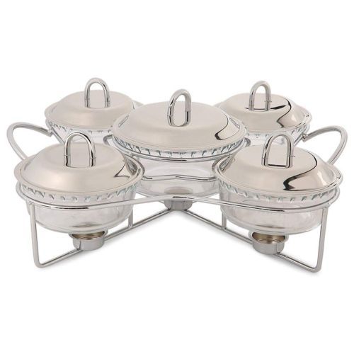 Key Features: Tea light candles provide heat to keep food at proper serving temperatures Resists stains and hence is easy to clean Well-contoured handle offers a comfortable grip Bowl material: glass With stainless steel support legs
