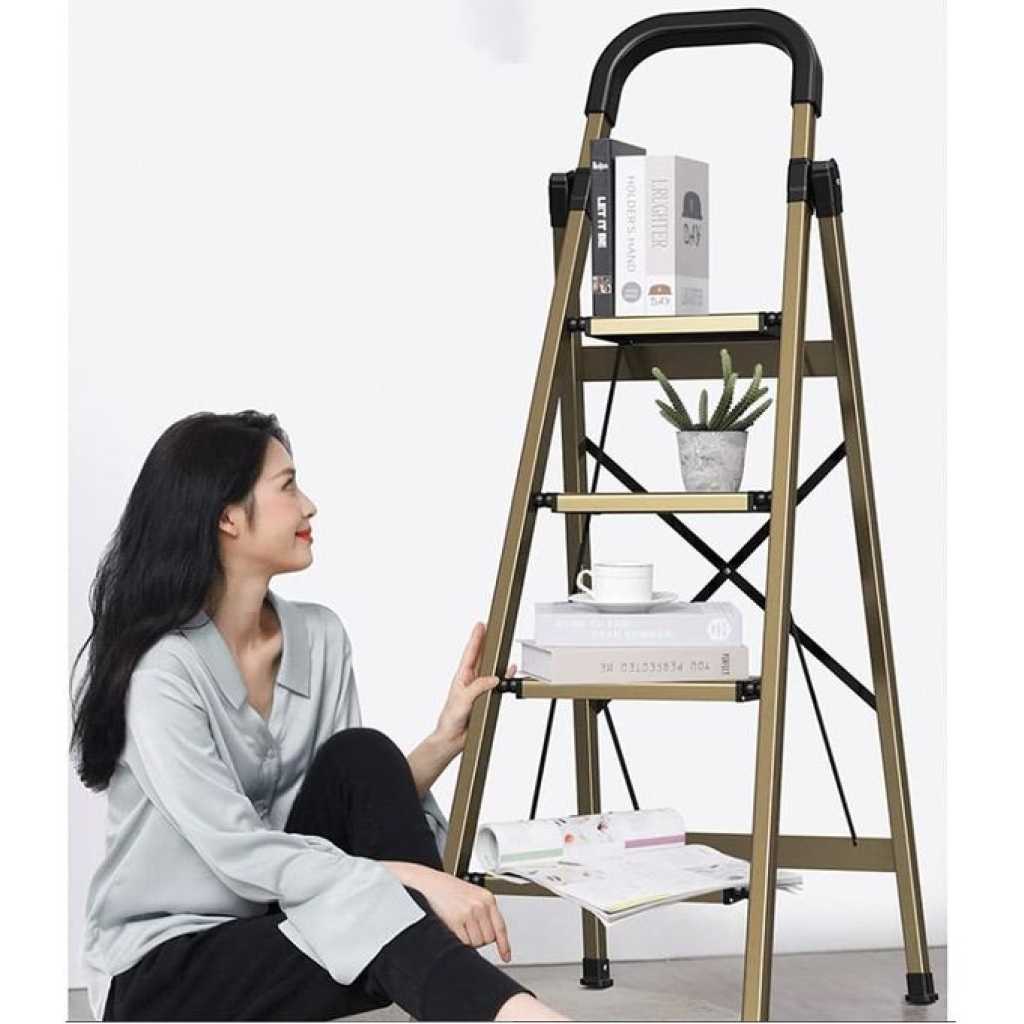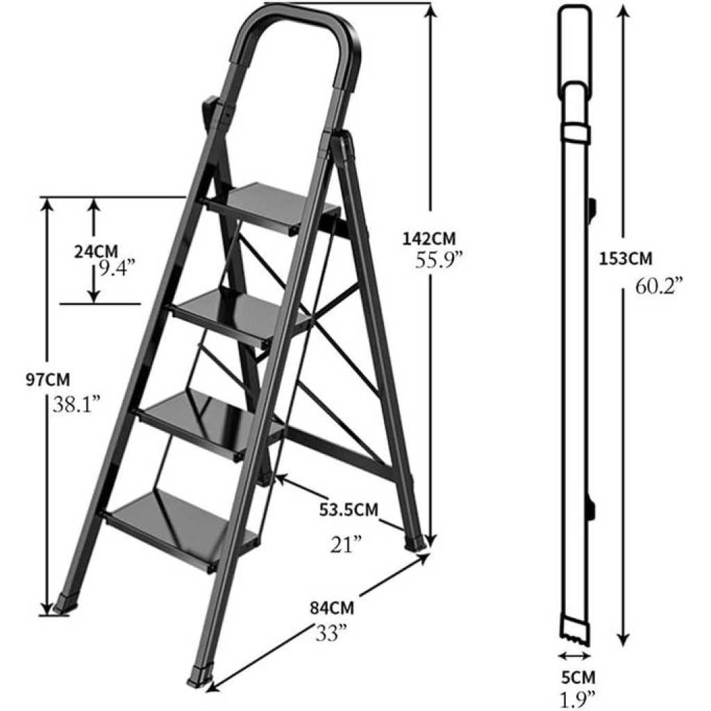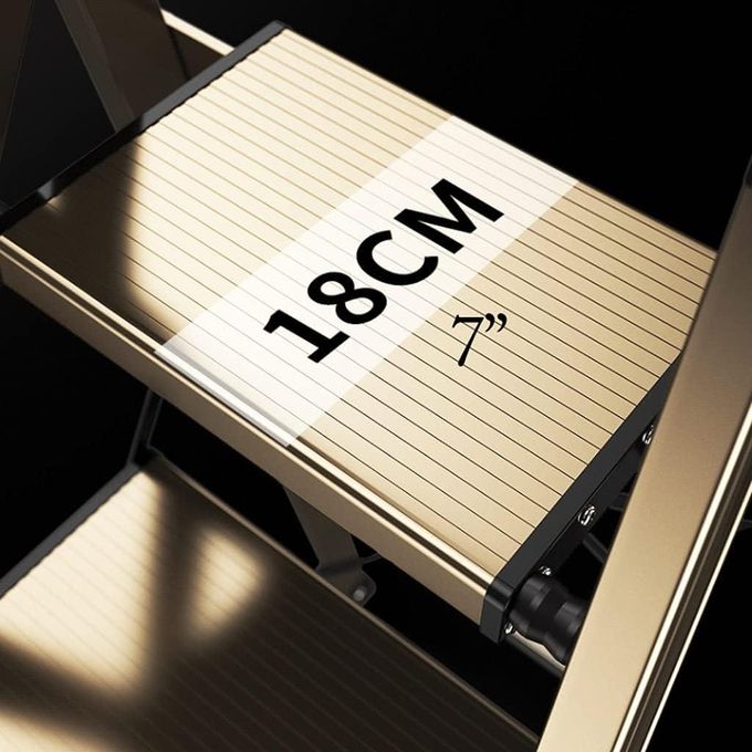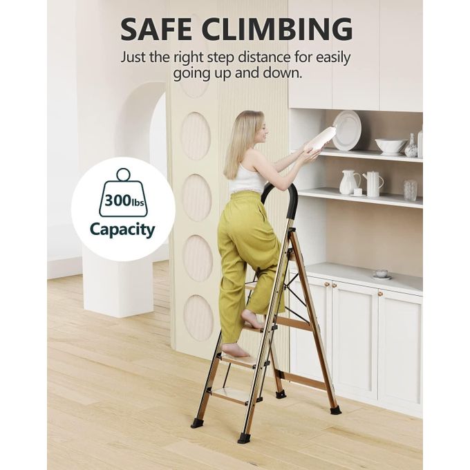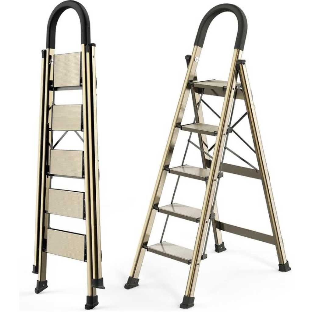 Key Features: 5 Step Ladder, Folding Step Stool with Anti-Slip Wide Sturdy Pedal with Convenient Handgrip, Portable Lightweight Aluminum Stepladder for Home, Office, Library Indoor 5ft Stepladders With Rubber-cotton Armrests his step stool is fully assembled, very light and easy to transport indoors or outdoors. The rubber-cotton armrests are closer to your hand, soft and more comfortable; two-way non-slip foot pads, the foot pads firmly grasp the ground and do not move back and forth. 18cm/7in wide pedal, deepen the texture and make it more slip resistant, and the texture effectively enhances friction After folding, the thickness is only 5cm/1.9in. The alloy beams are uniformly stressed and stabilize the foot of the ladder, which is safe and stable. 5.12kg weight, lightweight body, girls can easily lift with one hand; triangular mechanics design, scientific support, effective safety guarantee