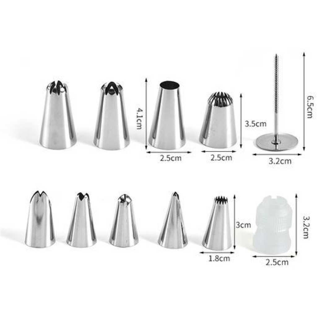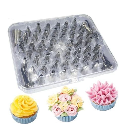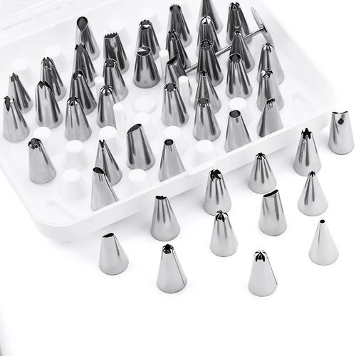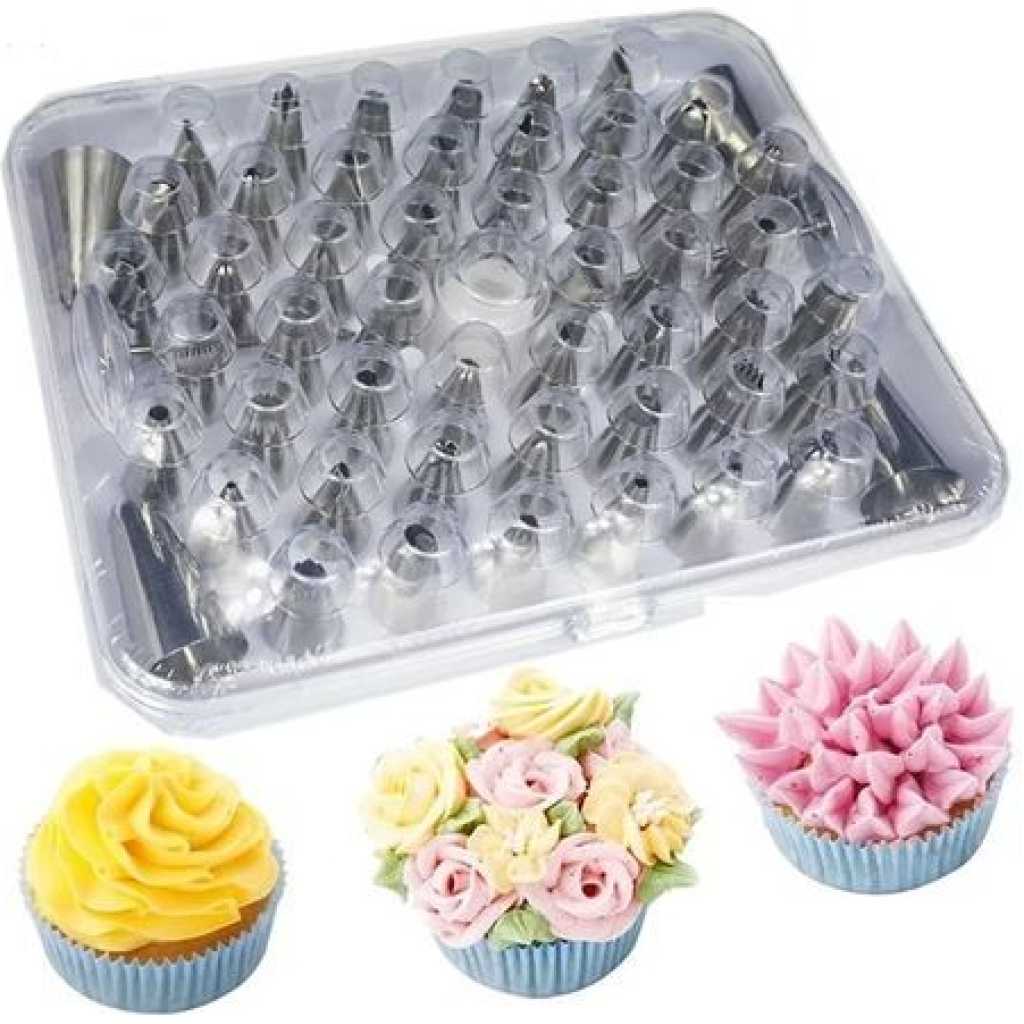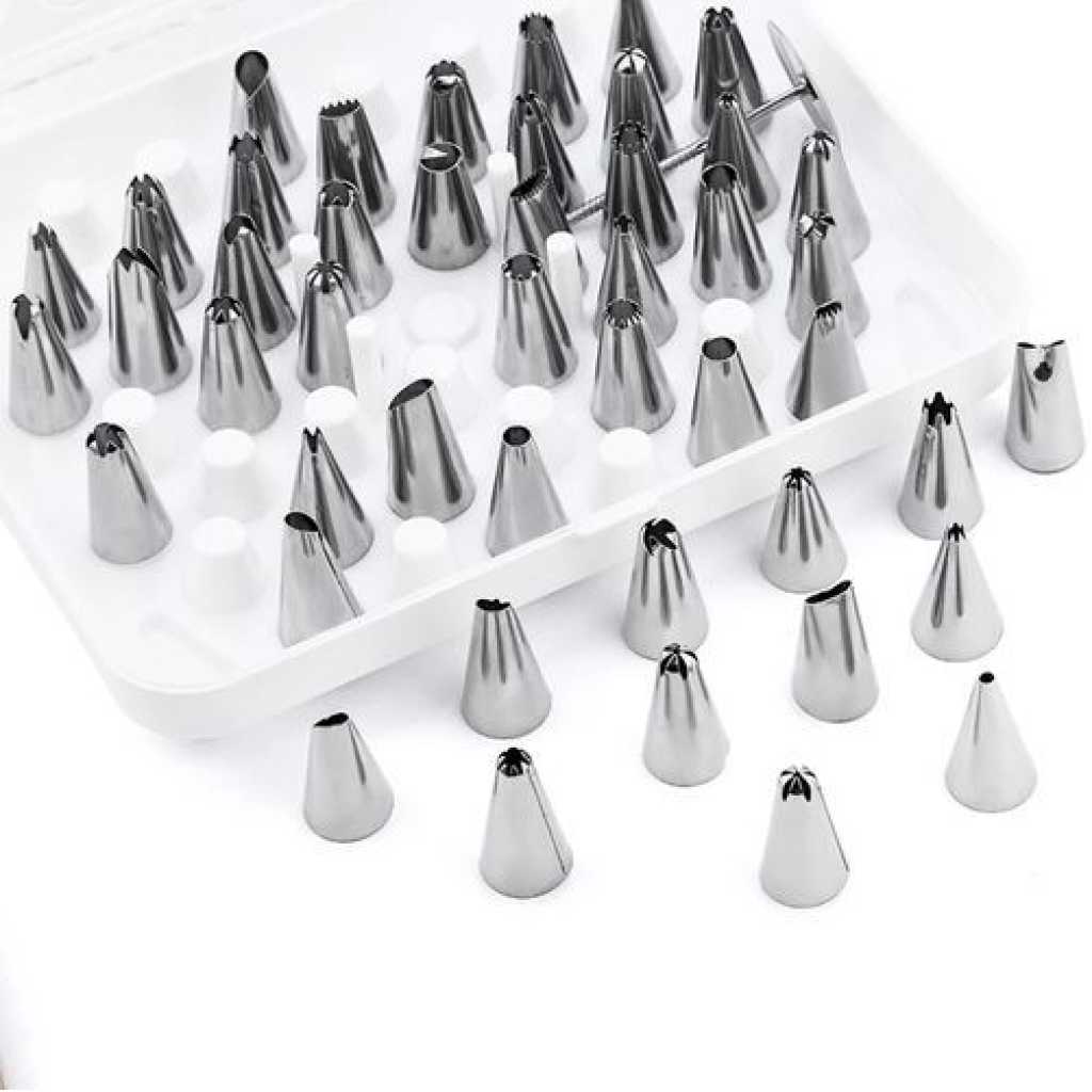50 Pieces Set Useful Cake Icing Decorating Tool Kit-Silver This icing decorating tool kit has 50 piping nozzles in a set. They are absolutely multi-purpose and very useful in decorating cake toppings and cupcakes. We highly recommend them to the best bakers out there. With this set, you will be able to make different cake designs as per each chosen piping nozzle. Key Features: 50 Pieces Set Useful Cake Icing Decorating Tool Kit-Silver Affordable Nicely packed in a plastic container Very easy to use It has a plastic screw for good fastening Comes with stainless steel piping nozzles Various designs for decorating It decorates cakes awesomely You can decorate cakes in different designs