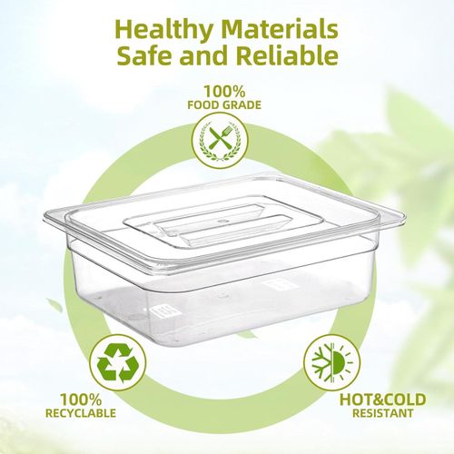 eep your food fresh and secure with the help of this Soro Essentials- Quarter Size 4″ Deep Polycarbonate Food Pan Clear Color Designed to expand the functionality of your food storage and serving operation, this food pan offers an economical option for busy foodservice establishments. A spoonable bottom makes removing contents easier, allowing your guests or employees to scoop up every ounce of food, reducing food waste. It’s perfect for use in your buffet line or salad bar! Thanks to the clear material, this food pan offers optimum visibility for quick product identification. The lugs help prevent the pans from sticking together so you can grab a pan without a problem in your busy kitchen. Optimize your food storage operation today with the help of this reliable pan! Measures 10-1/4” x 6-3/8″ x 4”, Quarter Size 4″ Deep Food Pan Clear Color, Polycarbonate.