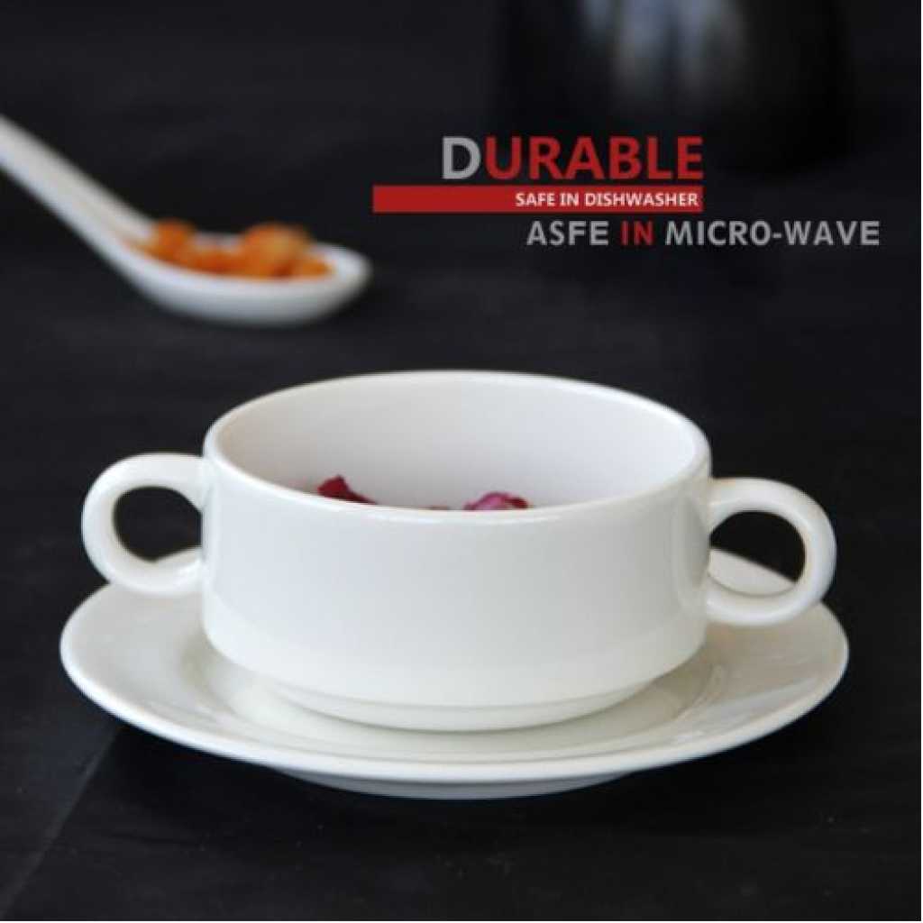 Bone China Soup Bowl with handle is a high-quality affordable dinnerware option that’s ideal for everyday use. The durable bone china material with its simple and clean design is perfect for contemporary uncomplicated lifestyles. Two side handles and a generous size make it the perfect choice for you to enjoy lunchtime soups and hearty dinners.