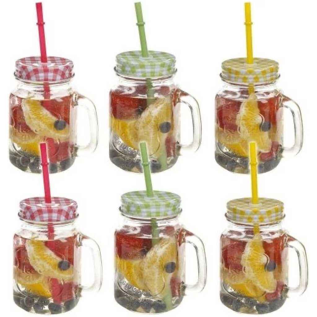 6 Pieces Of Juice Glass Mason Jars Cup Mugs- Colorless These glass Mason jar glasses come with a METAL screw-top lid, striped straw and hold up to 500ml of liquid. They can be used time and time again and are very resilient. Great for BBQs, parties, weddings and picnics – the possibility is endless! Dishwasher safe.
