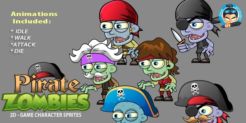 6- Pirates Zombie Character Sprites Set. Game Character Sprites