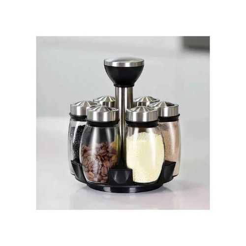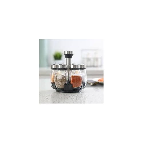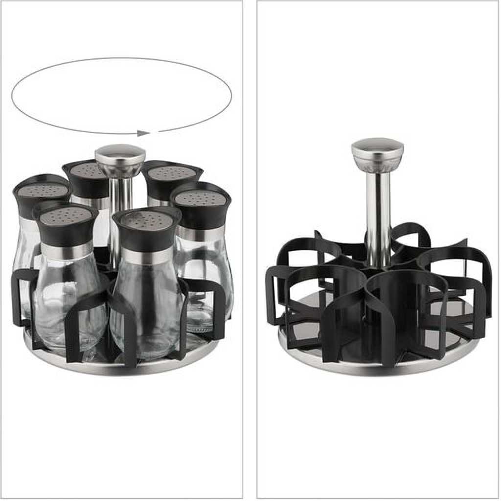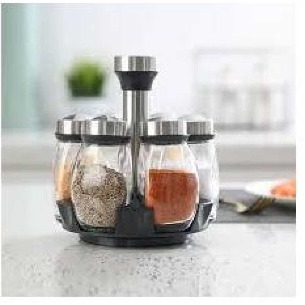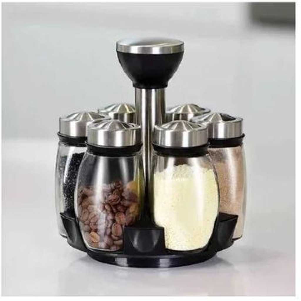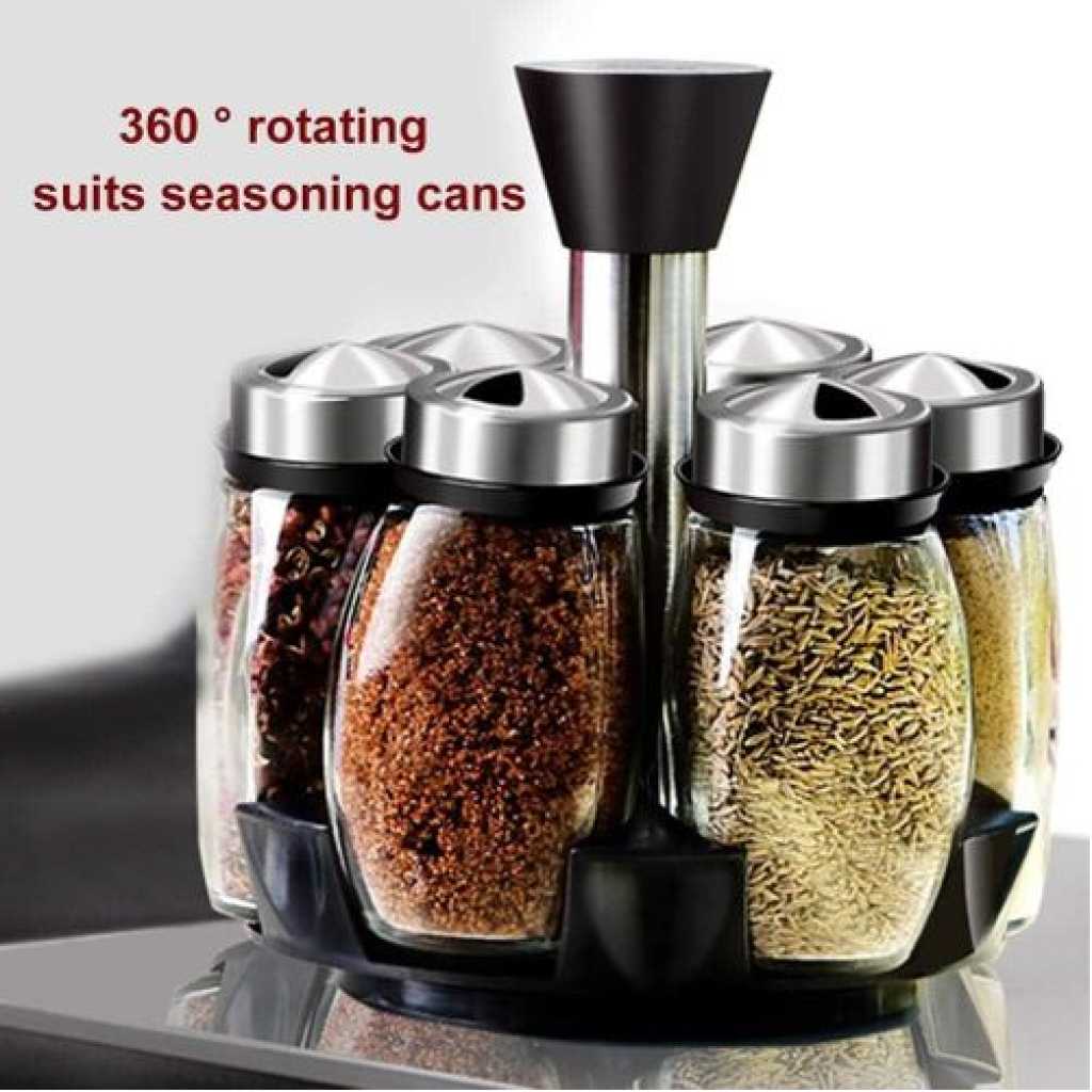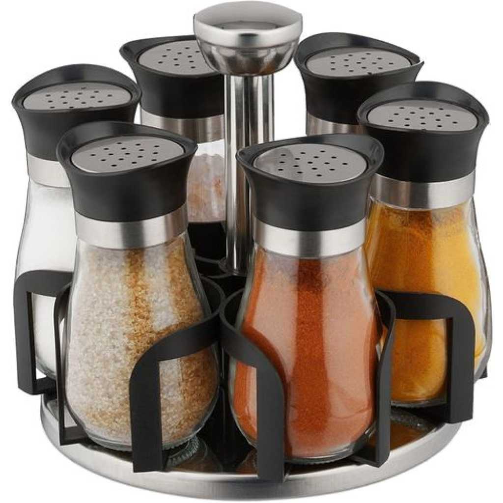 Revolving Spice Rack, 6-Jar Seasoning Organizer Holder 360° Rotation Shelf Tower Set with 6 Glass Spice Refill Containers Jars for Cabinet Countertop Kitchen Cooking (Spices Not Included) · 360°Rotating Design – No need to look for a seasoning in a heap of messed bottles on the countertop, 360 degree rotating spice rack can keep your seasonings in order and clean, saving your time and efforts. · 5 Jars in the Set – 5 lead-free glass bottles can storage 5 different frequently-used spices, meet the needs of daily use. It is the best organizer tools in the kitchen. · 3 Types Setting Lids – 3 different types of lids to 6 spice jars, each individual jar features a rotating four-setting lid that allows you to conveniently and precisely dispense exactly what you need. · Easy Clean – Wipe with a damp cloth and leave to dry; the jars can be cleaned in warm soapy water; ensure they are completely dry before refilling with contents; do not immerse the carousel in water or place in the dishwasher. Key Features: 【360° Revolving Spice Rack】With 360° rotation base, you can freely rotate the rack shelf, to get the spice you as you need, quick operate for cooking. 【Keep Seasonings in Order】This revolving spice rack tower can keep your seasonings in space, make your countertop clean and orderly. Rotated rack is very convenient to find and take the seasoning you need, you will never worry to pour wrong spices into the dishes. 【3 Types Bottle Lids Covers】6 stainless steel bottles covers with 3 different open types, you can put different spices in different bottles as the best option. Sealed covers when locked up will keep the seasonings from wet. 【Glass Material Keeps Fresh】Glass made separated seasoning containers always keep your spices fresh, make sure they will not tainted by each other. The lead-free glass material is also BPA free, you can use it for years. 【Save Space on Countertop】Compositive tower designed spice rack can save lots of spaces on your limited countertop, it is very handy and frees up space to store other cooking ingredients.