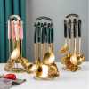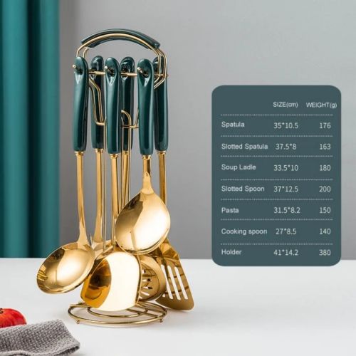 7 Pc Kitchen Tool Cooking Utensils Serving spoons Minimize countertop messes and reduce cross contamination of foods with the Elevate tool collection. This set includes 7 essential kitchen tools: flexible turner, slotted spoon, slotted turner, ladle, spaghetti server and solid spoon. These innovative tools have a weighted-handle system and small foot under the handle, so the utensil can be placed down without having the end touch your work surface. The rotating stand neatly stores your tool set and features a non-slip Steel base. Stylish and durable, it looks great on the kitchen worktop. Perfect for use with all kinds of cookware, the heads won’t scratch and are heat resistant up to 480°F. Handles are ergonomic and have a comfortable feel. All surfaces that come in contact with food are BPA free.