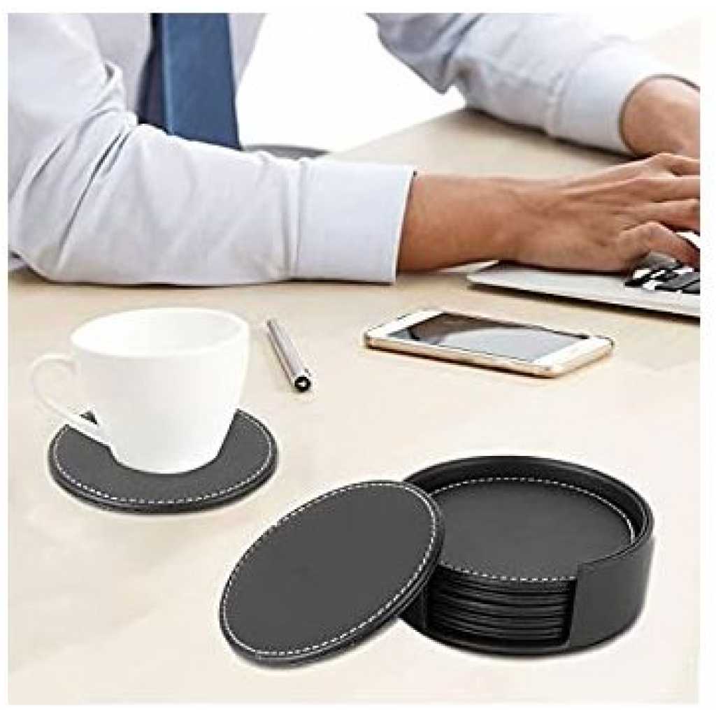 Key Features: 7 Piece Leather Drink Coasters Round Cup Mat Pad for Home And Kitchen – Black MODERN DESIGN: Leather coasters set with holder(6 pcs per set). Well-selected double-deck PU leather for better heat insulation and durable use. Each side is leather and sewn together by a white thread which looks really nice, fashionable, and luxurious. SAFETY MATERIAL: Leather Coasters are made of high-quality PU leather material, eco-friendly, with no smell, lightweight, durable, non-slip, and water resistant. EASY TO CLEAN: The leather coasters set is water resistant, which can be simply washed under running water, then wipe with a dry cloth, and re-use immediately. EXTREMELY USEFUL: Keep your furniture from water marks and damage. The coaster set is suitable for all cups, glass, and mugs, and can be used for both hot and cold drinks such as spoon rest, barware set, wine, beer, and other beverages. FRIENDLY REMINDER: All CARAWAY leather coasters are backed up with 30 days return policy and lifetime-friendly customer service. If any questions please do not hesitate to contact us, we are always here and ready to help.