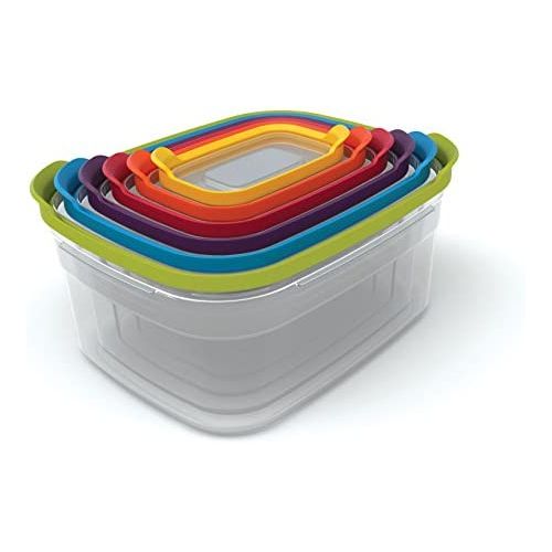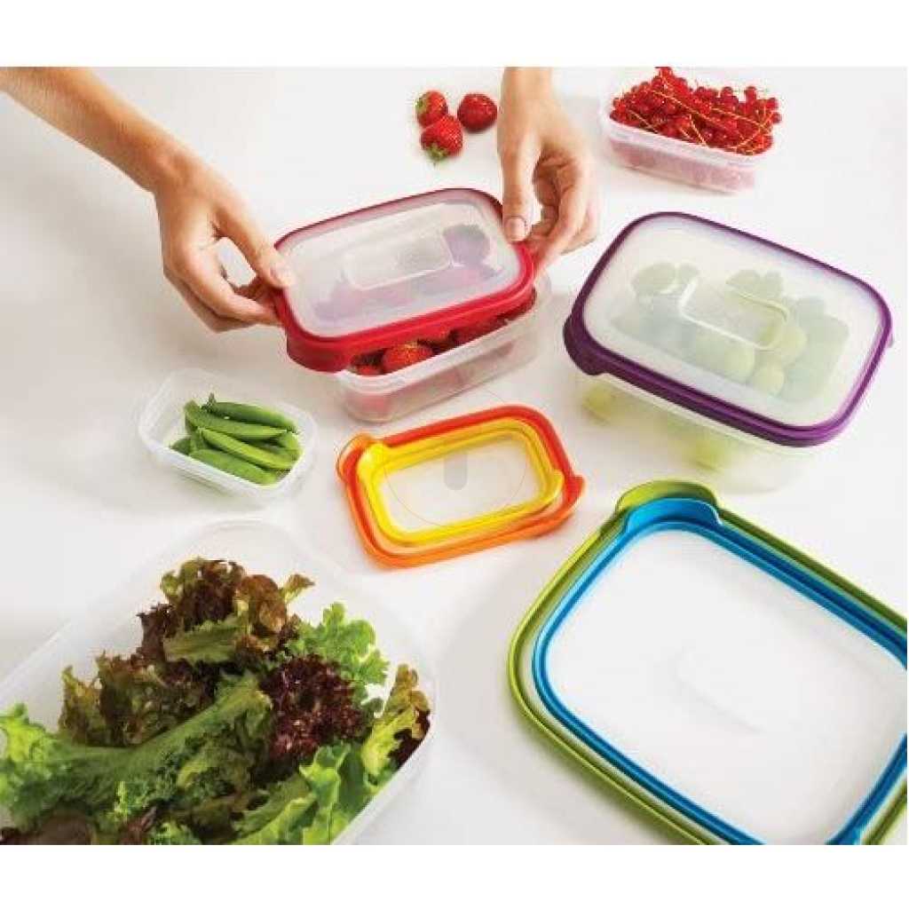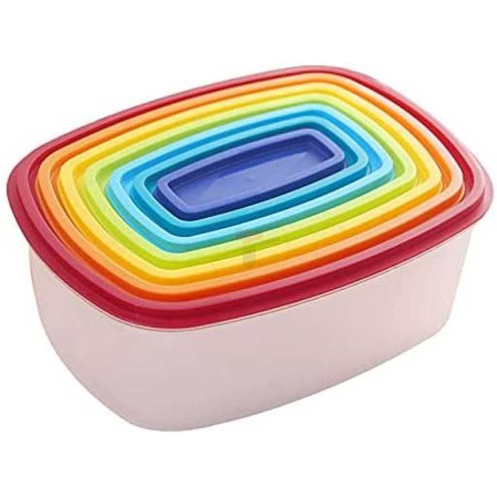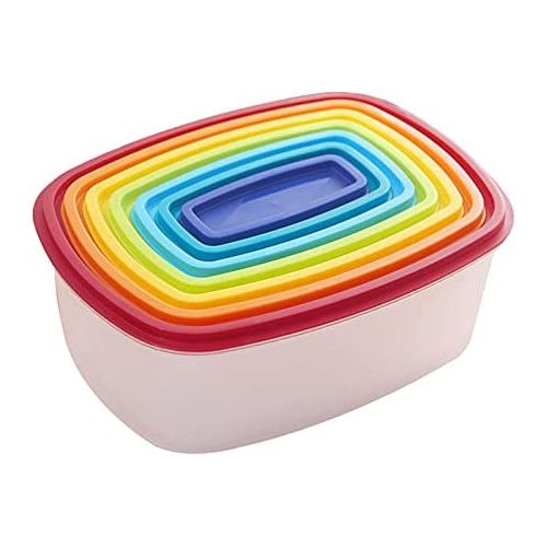 Key Features: 7 Piece Rainbow Plastic Fridge Storage Food Containers With Leakproof Lids- Multi-colour. Plastic bin that stores and pours kitchen food Food storage containers keep food fresh for a longer time with an Air-tight seal Holds kitchen staples like flour, sugar, rice, nuts, beans, snack, food, cereal, coffee, or tea Dishwasher Refrigerator, Freezer, & Microwave Safe BPA Free