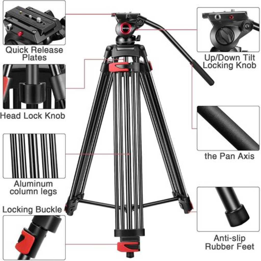72 Inches Video Tripod, Professional Heavy Duty Aluminum Tripod System, 360 Degree K3 Fluid Head with Carry Bag, DSLR Camcorder Camera, Max Loading 33LB ( Black What Stands Out Sturdy Construction Crafted from heavy-duty materials, this tripod ensures stability and durability, supporting up to 26.5 pounds. Ideal for professional use, it withstands the rigors of filming in diverse environments. Fluid Head Design Equipped with a 360-degree fluid head, it allows for smooth panning and tilting. This feature enhances video quality by providing seamless transitions, critical for dynamic shooting scenarios. Extended Height Standing at 72 inches, this tripod offers impressive height adjustments to capture unique angles. Perfect for both DSLR cameras and camcorders, it empowers filmmakers to unleash their creativity without constraints. Product Details 【Heavy Duty and Stable Design】 Max Loading Capacity 26.5 lbs. Professional aluminum twin-tube tripod has its own bubble level on tripod leg. The ENLARGED adjustable anti-skid rubber pads with 75 mm bowl base provide more stability. The triangular center system prevents the tripod from folding when on uneven ground. 【Fluid Head with Double Bubble Levels】Professional camera head, with a 360-degree scale for easy connection. The dynamic balance system makes the fluid head run smoothly. It tilts +90/-75° vertically and rotates 360° horizontally. The 2-section detachable handle can be installed on the right or left. TWO level gauges helps adjust the level according to demand. 【Fast Release Plate】 Equipped with a 1/4-inch camera screw and a spare 3/8-inch camera screw, which is very suitable for most brands of cameras and camcorders. The aluminum alloy safety button on the video head prevents the device from falling. 【Easy to Assemble】The ergonomic flip locking system makes the legs locking more fasten, and unlocking more convenient and fast. And our unique Anti-Loose System prevents the leg being loose effectively. 【Parameters】 3 Bubble Levels – 2-section handle – 26.5 lbs Loading Capacity – 34″ to 72″ Height Range – Tilt Angle +90° / -75° – 360° Panning – Product Weight 9.9 lbs