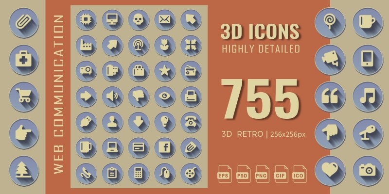755 Retro 3D Web Communication Icons Set. 755 Retro 3D Web Communication Icons Set,Perspective with Shadow.