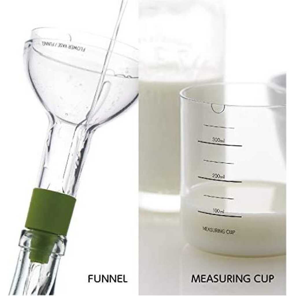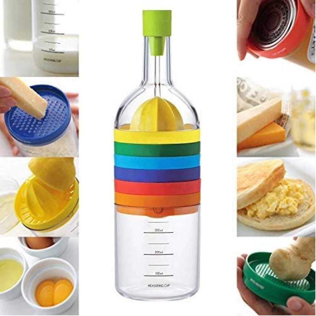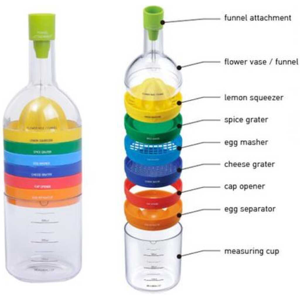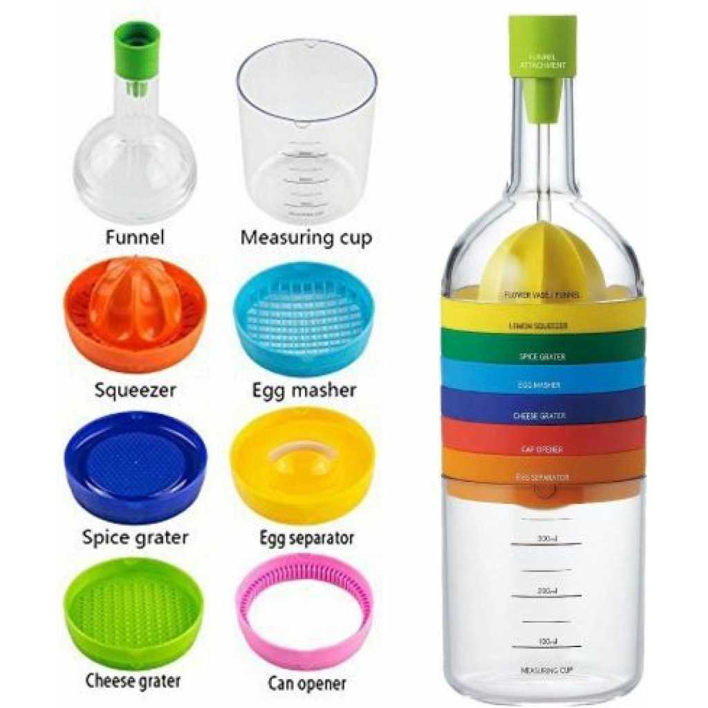 Key Features: 8-in-1 Kitchen Tool Set Multipurpose Bottle Funnel, Flower Vase, Lemon Squeezer, Spice Grater, Egg Masher, Cheese Grater, Cap Opener, Egg Separator, and Measuring Cup. Interchangeable plastic blades. Easy to use crank mechanism. Angled distributor reduces clogging. All parts are detachable for cleaning. Made of plastic and stainless steel. Combines 8 essential kitchen tools. All parts stack together in a bottle. Dimension – Height: 28cm/11.02 inches, Diameter: 8.5cm/3.35 inches. Colors are different for easy recognition.