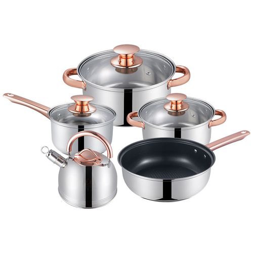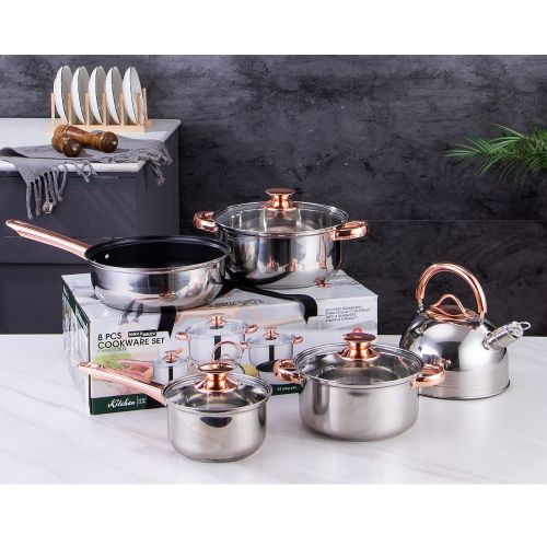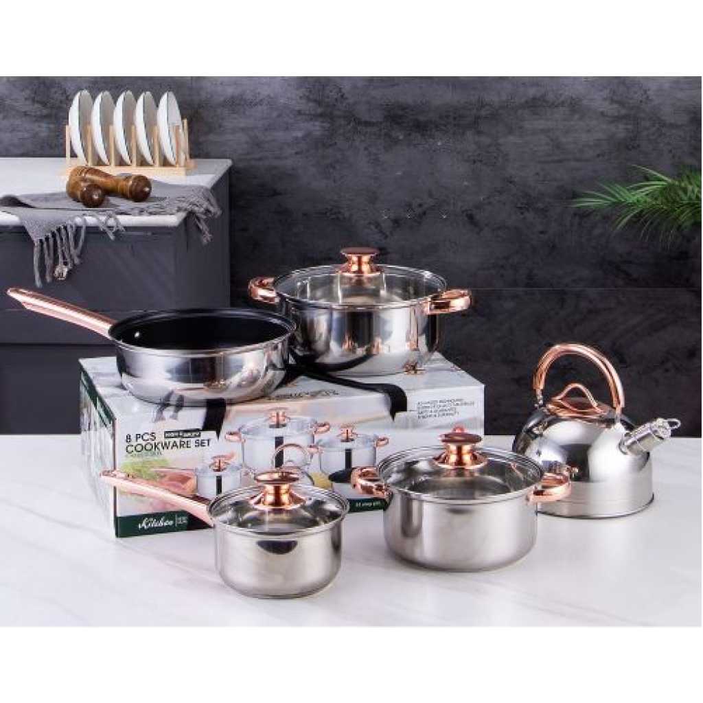 Key Features: 8 PC Stainless Steel Saucepans Cookware Pots With Kettle And Frying Pan Color: Silver Material: stainless steel. Cover material: heat-resistant glass. Number of items in a set: 8 Bottom type: 5-layer. Measurement scale: yes. Handles fastening method: riveted connection. Handle type: hollow. Lid with a steam outlet: yes. Metal polishing: mirror/satin. Dishwasher safe: yes.