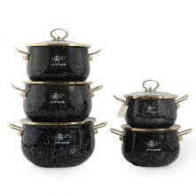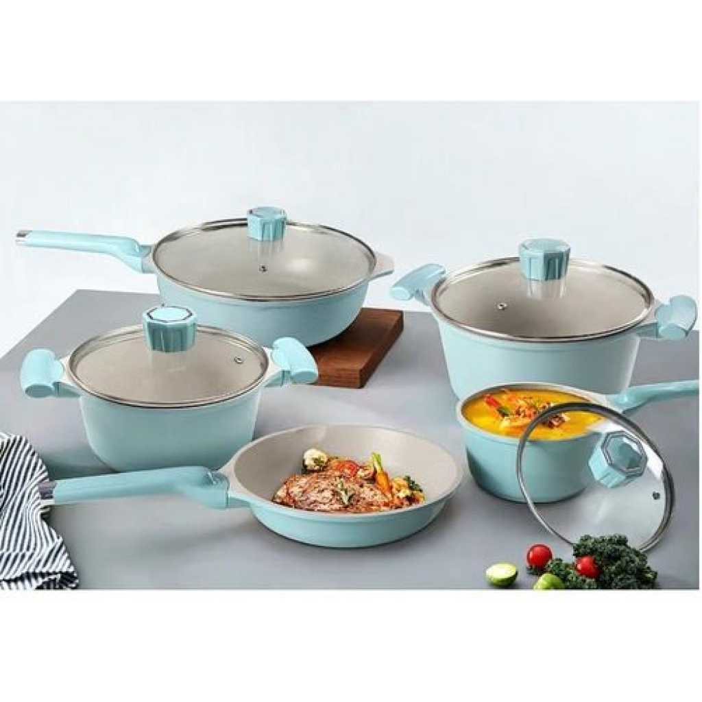9 Piece Granite Cookware Set Non-stick Pots & Pans Home Kitchen Cooking Lids Pot- Multicolor Get cooking with the Non-Stick Red Cookware Set, 9 Piece. This comprehensive set is a terrific starter set with all the necessary pieces for everyday cooking, at an affordable price. The cookware set includes all of the essentials: a 7″ saute pan, a 9″ covered deep saute pan, a 1 qt covered saucepan, a 2 qt saucepan, and a 4 qt Dutch oven for cooking large meals. Riveted handles allow for safe handling. All pans include heat and shatter-resistant tempered glass lids for easy simmering; non-stick coating allows for effortless food release and cleaning.