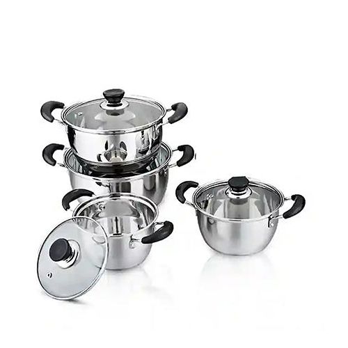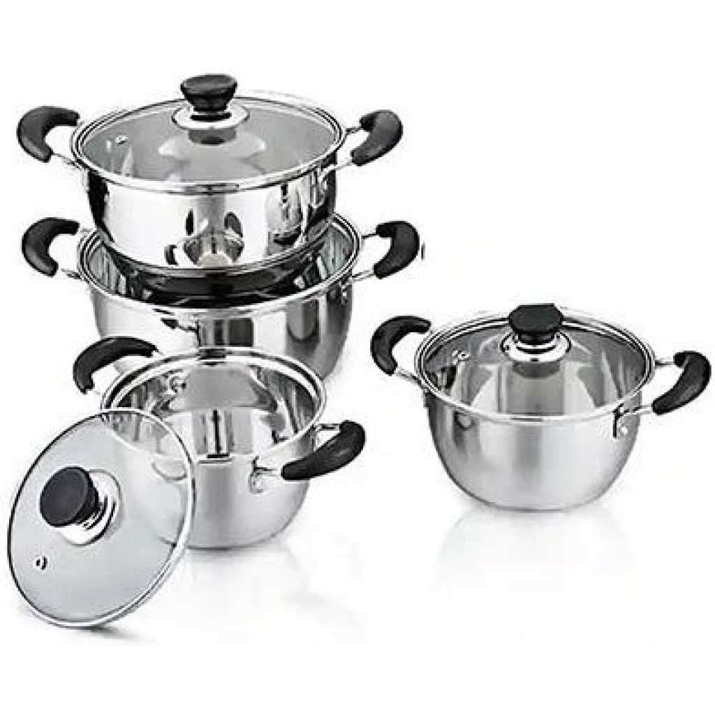 This stainless cookware set is built to last a lifetime. Elegant design is easy to use, nice to stack, excellent range of sizes. You can put them in the oven with the lid on. This is the cookware set you will ever need. LFGB & FDA listed for your health, environmental-friendly & PFOA-free Teflon generates zero chemicals, defending health for you and your loved ones ERGONOMIC CURVED HANDLE: revolutionary handles are designed to keep you from fatigue even after long sessions of cooking STUNNING 9 PIECES SET: come in an elegant color, and fits well into any decor, the durable, soft, comfortable, and colorfast coating on handles and lid finials provide superior heat-resistant performance for your safety during cooking BREAK-RESISTANT LID & MULTI-LAYER BOTTOM: clear glass lid for easy observation during cooking; multi-layer bottoms distribute heat evenly and are compatible with types of the cooking range including induction cookers, gas range Key Features: Sold 4 pots 4 lids and 1 kettle Kettle whistles when the water is ready The set is for both cooking and serving purposes Affordable Made of high grade stainless steel The lids are transparent The set has handlles and knobs Good quality set