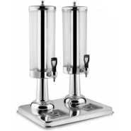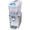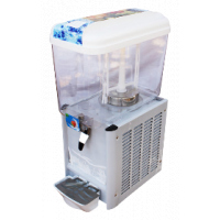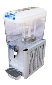 9L Single Juice Dispenser – White A juice dispenser is one that dispenses or gives out, especially a machine or container that allows the contents to be removed and used in convenient or prescribed amounts. 1. Food-grade high density polycarbonate bowl, unbreakable 2. #304 stainless steel evaporator 3. Stainless steel tap lever 4. Middle or High back pressure hermetic compressor, low noise less than 55db 5. #304 stainless steel chassis and panels 6. R134a gas, Ozone friendy 7. Paddle stirring system 8. Color: white 9. Voltage and cycles upon request In accordance with the preferred embodiment of the present invention, there is provided a beverage dispenser which includes a housing for supporting the internal and external components of the beverage dispenser. The housing is designed to hold one or more liquid containers filled with a liquid such as a fruit or vegetable juice concentrate. The housing may also include a refrigeration unit to maintain the liquid within the container at a proper temperature. Connected to the face of the housing is preferably one or more dispensement nozzles from which a final liquid product is dispensed to the consumer. Inside the housing is included a fluid metering mechanism which controls the amount of liquid dispensed from the liquid container to the dispensement nozzle . The fluid metering mechanism preferably includes a container coupling mechanism which connects the liquid container to a pump mechanism for pumping the liquid from the liquid container to the dispensement nozzle. The pump mechanism may include a pump motor and a pump. The fluid metering mechanism may also include a valve block designed to mix the liquid in the liquid container with a diluent prior to dispensing the final liquid product. The liquid in the liquid container is preferably a concentrate and must be diluted prior to consumption. A brix controller may be incorporated to control the amount of dilution of the liquid concentrate. The container coupling mechanism is designed to include several components such as a flush valve, a container adapter and a connector bottom. The container adapter is designed to integrate with the liquid container and form a connection with the liquid container which minimizes leakage. The connector bottom is designed to be coupled with the pumping mechanism and to minimize leakage of liquid as it passes to the pump mechanism. The flush valve is designed to be a moveable component which is substantially sealed between the container adapter and the connector bottom. A sealing mechanism which preferably incorporates seals such as O-rings is used to substantially seal the flush valve between the container adapter and the connector bottom. The container coupling mechanism also includes a seating arrangement which is used to assist in sealing and orienting the container adapter, connector bottom and flush valve. The dispenser may also incorporate an electrical circuit and/or control circuit to control the operation and/or flushing of the dispenser. The dispenser includes a housing design to hold one or more liquid containers filled with a fruit or vegetable concentrate and a fluid metering mechanism for providing the liquid concentrate from the liquid containers to a consumer. The fluid metering mechanism is a modular component which simplifies maintenance and repair of the dispenser and further reduces leakage.