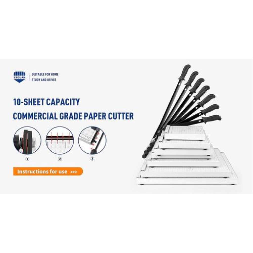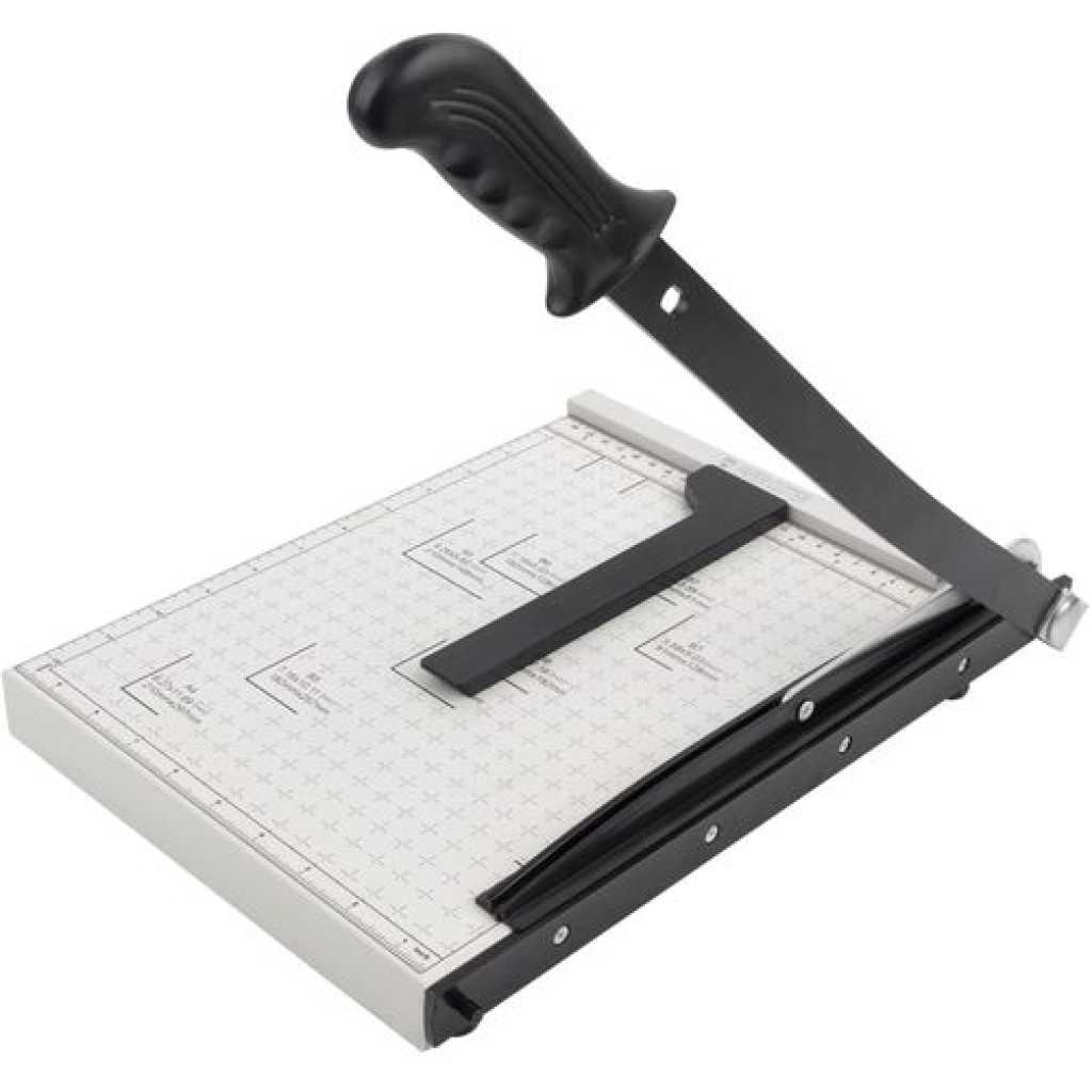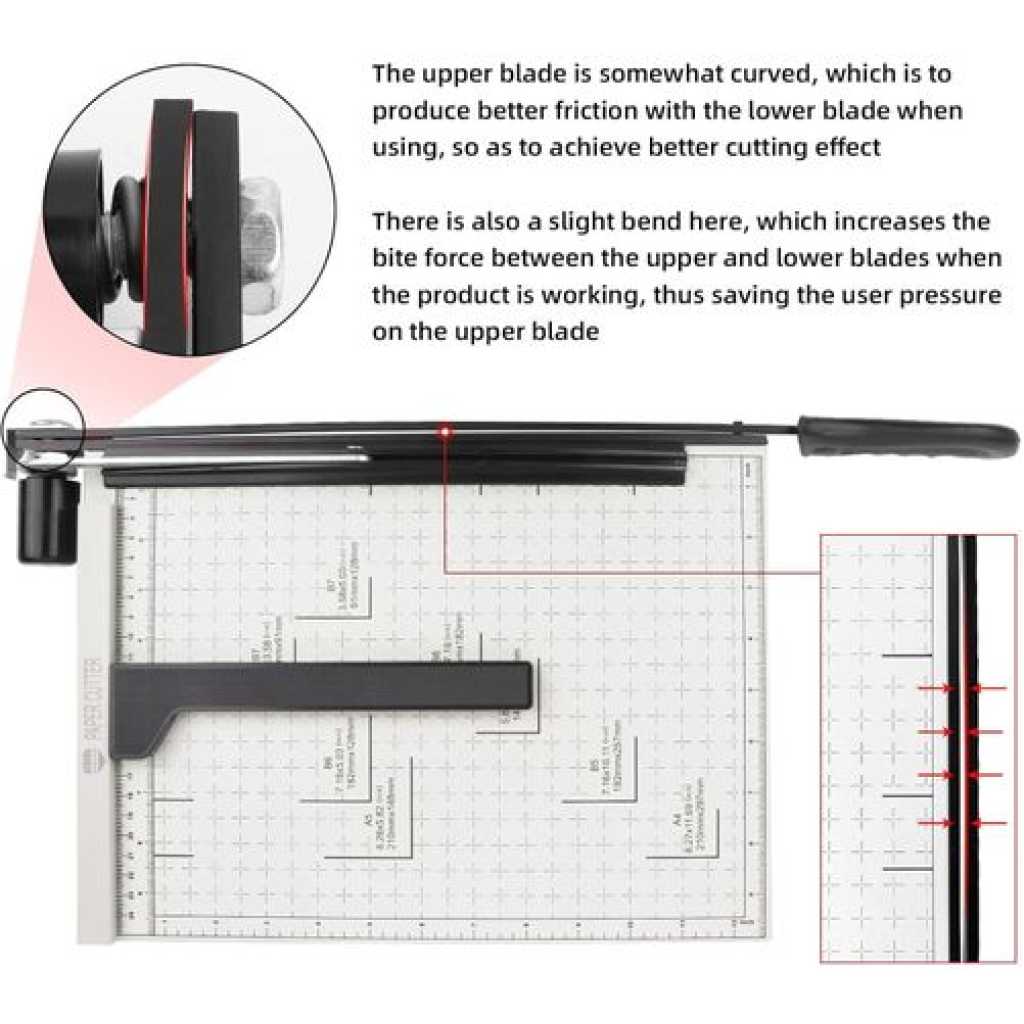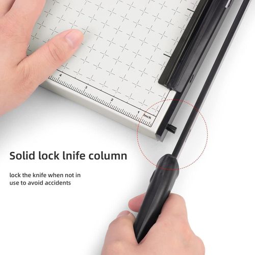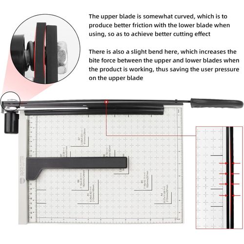 Safety Blade Lock Ensures user safety by securely locking the blade when not in use, preventing accidental injuries. Ideal for schools and homes where safety is a top priority. 12 Sheet Capacity Efficiently cuts up to 12 sheets of paper at once, significantly speeding up project completion times. Perfect for offices handling high volumes of paper. Heavy Duty Design Constructed for durability, this heavy duty guillotine withstands frequent use without compromising on performance. A reliable choice for both home and professional settings. 【Multi-scene Use】– This paper cutter can meet various cutting requirements, such as paper, photos, pictures, labels, business cards and other paper products, as well as thin metal sheets below 0.3mm/0.01in, suitable for paper DIY handicraft production. It is the partner for office, school, home, printing house and photo studio 【About the blade】– This paper cutter contains two steel bars, the upper and lower, and the upper bar is somewhat curved to create better friction with the lower bar when in use, resulting in better cutting results (When using a paper cutter, it is recommended to try from a small amount of paper)