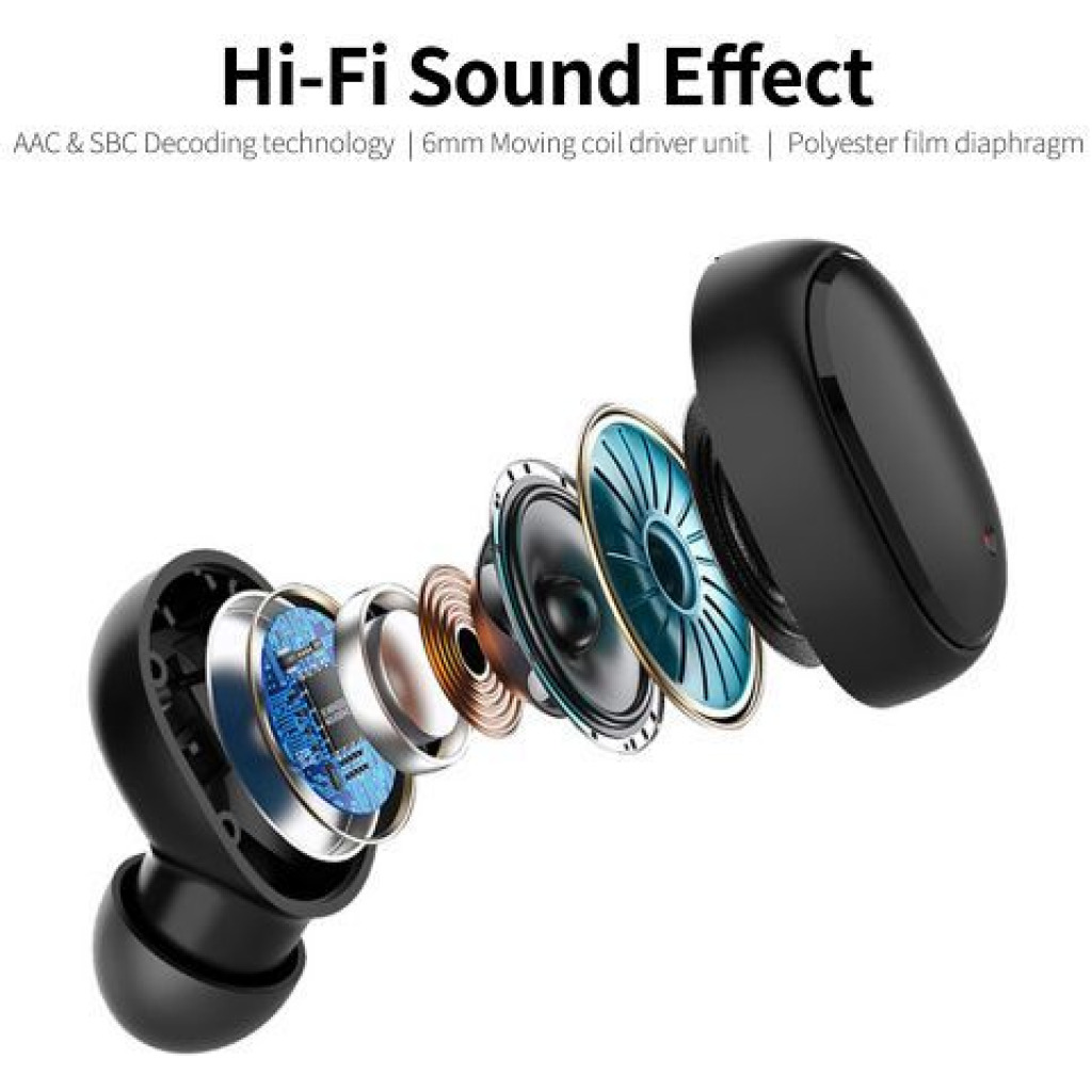 Key Features: BT V5.1:It offers lower power consumption, stable connection and wide compatibility. Auto Connection:It supports connect with your phone automatically after the first connection. Hi-Fi Sound Effect:With AAC and SBC decoding technology, 6mm moving coil driver unit and polyester film diaphragm, it offers immersive music experience. Dual Master Earbuds:You can use two earbuds together or one of them to fulfil your different needs. Touch Control:You can touch L or R earbud to quickly play/ pause music, answer/ hang up phone calls, switch among songs. Wake Up Voice Assistant:Click three times to wake up your voice assistant to quickly finish intended operation.