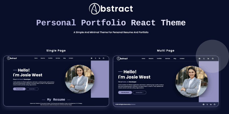 Abstract - React js personal portfolio . This React.js personal portfolio theme not only highlights your work but also reflects your personality and professional ethos.