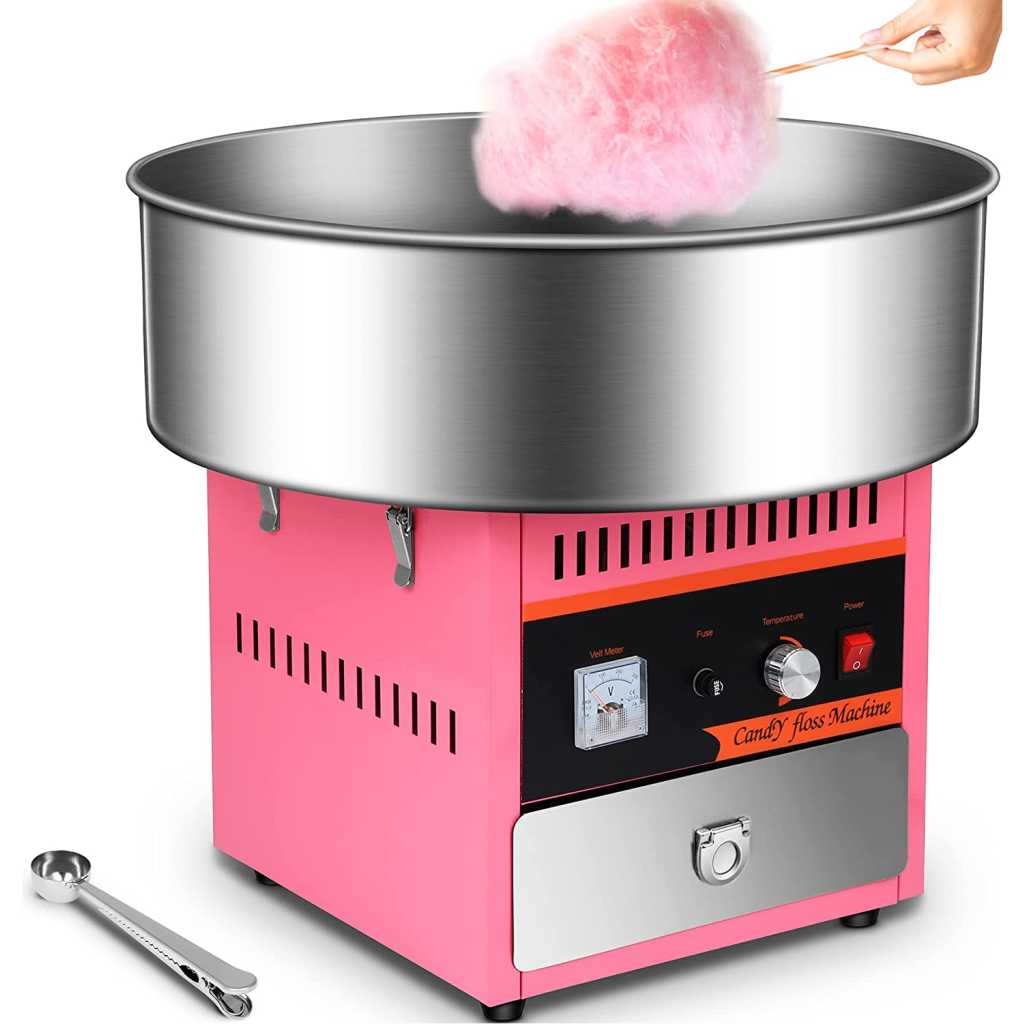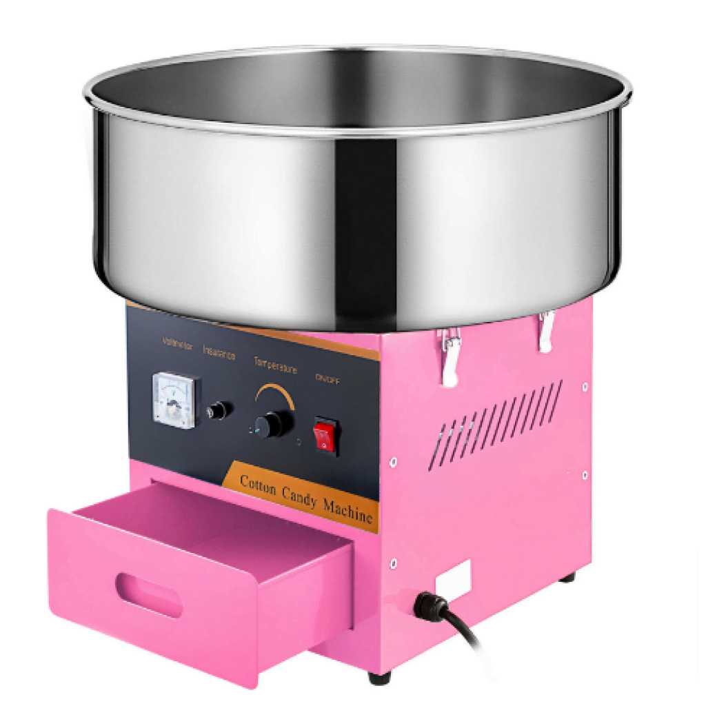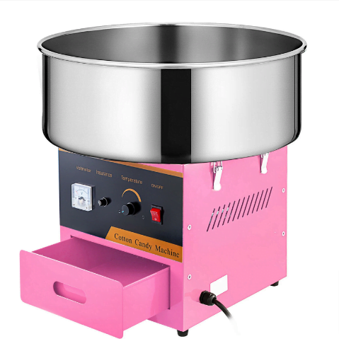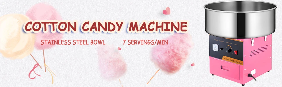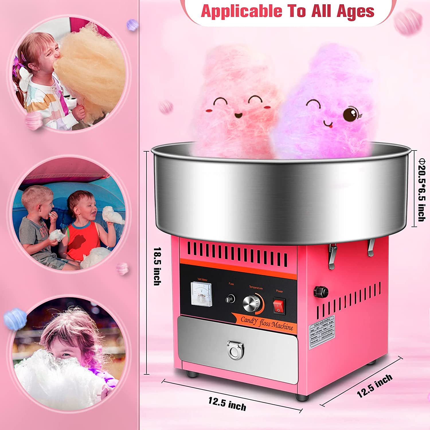 ADH Commercial Cotton Candy Floss Machine Features & Details 【ASSURING QUALITY】- Commercial cotton candy machine, with 1000W max heating power, 30W operating power. 21″ food-grade stainless steel bowl, easy cleaning. Aluminum sugar outlet for even heating. 【CONVENIENT & EFFECTIVE】- Cotton candy maker machine with simple and precise control area, including voltage meter, fuse, stepless temperature controller, easy ON/OFF button. User-friendly even for beginners. Quick, yet whisper-quiet operation to produce up to 7 servings of tasty cotton candy in a minute, creating a wonderful experience for you! 【STABLE DESIGN】- Tough stainless steel locking clips and rubber gaskets help hold down the bowl tightly. Skid-resistant rubber feet decreases vibration, making candy making process smooth and quiet! 【EASY OPERATION】- Turn on the motor and warm up for 2 minutes. Then turn on booster (4 minutes’ warm up). Just pour floss in sugar cap and you have get your own cotton candy! Convenient drawer for storing raw materials and tools. 【CREATIVE & ENJOYABLE】- Innovative design makes setting up easy and cleanup super fast, so you can indulge in a flavorful treat whenever without having to spend unwanted time cleaning up. Great for birthday parties, graduation parties, festivals, carnivals and fairs Electric Commercial Cotton Candy Machine With sugar as the main raw material, this pink hard candy cotton candy maker can produce colorful cotton candy with a variety of tastes. Products are no longer simply white, but red, yellow, blue, green, purple, and other colors, environmental health and delicious. Produces up to 7 servings of cotton candy per minute, great for birthday parties, graduation parties, festivals, carnivals and fairs.