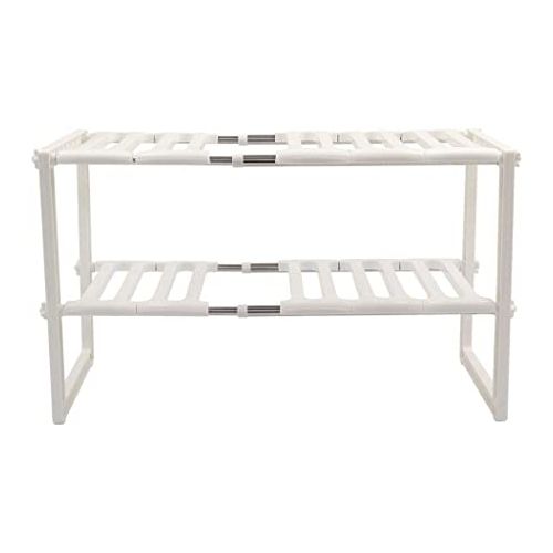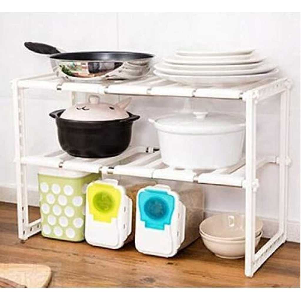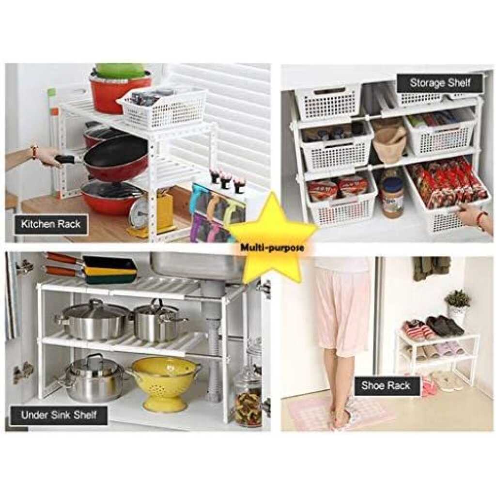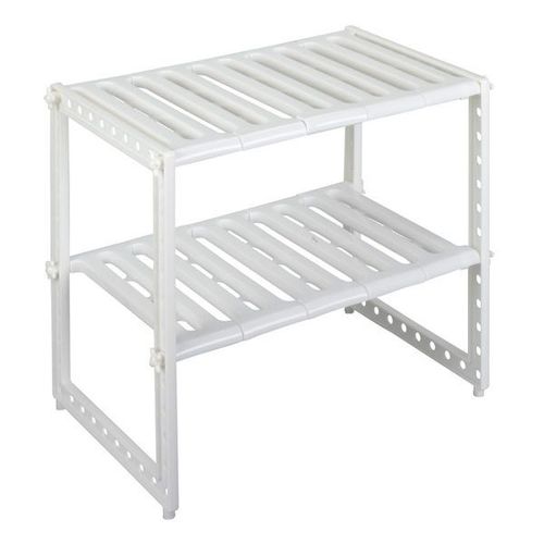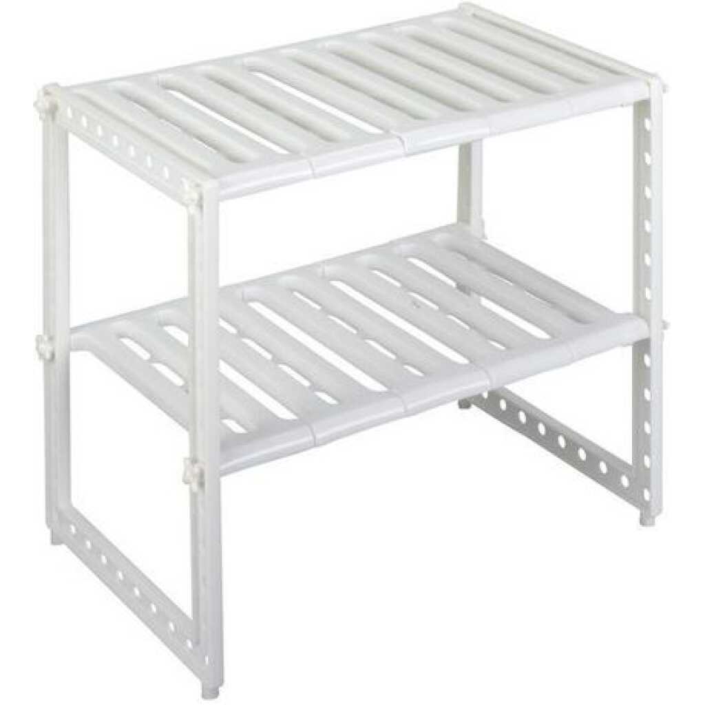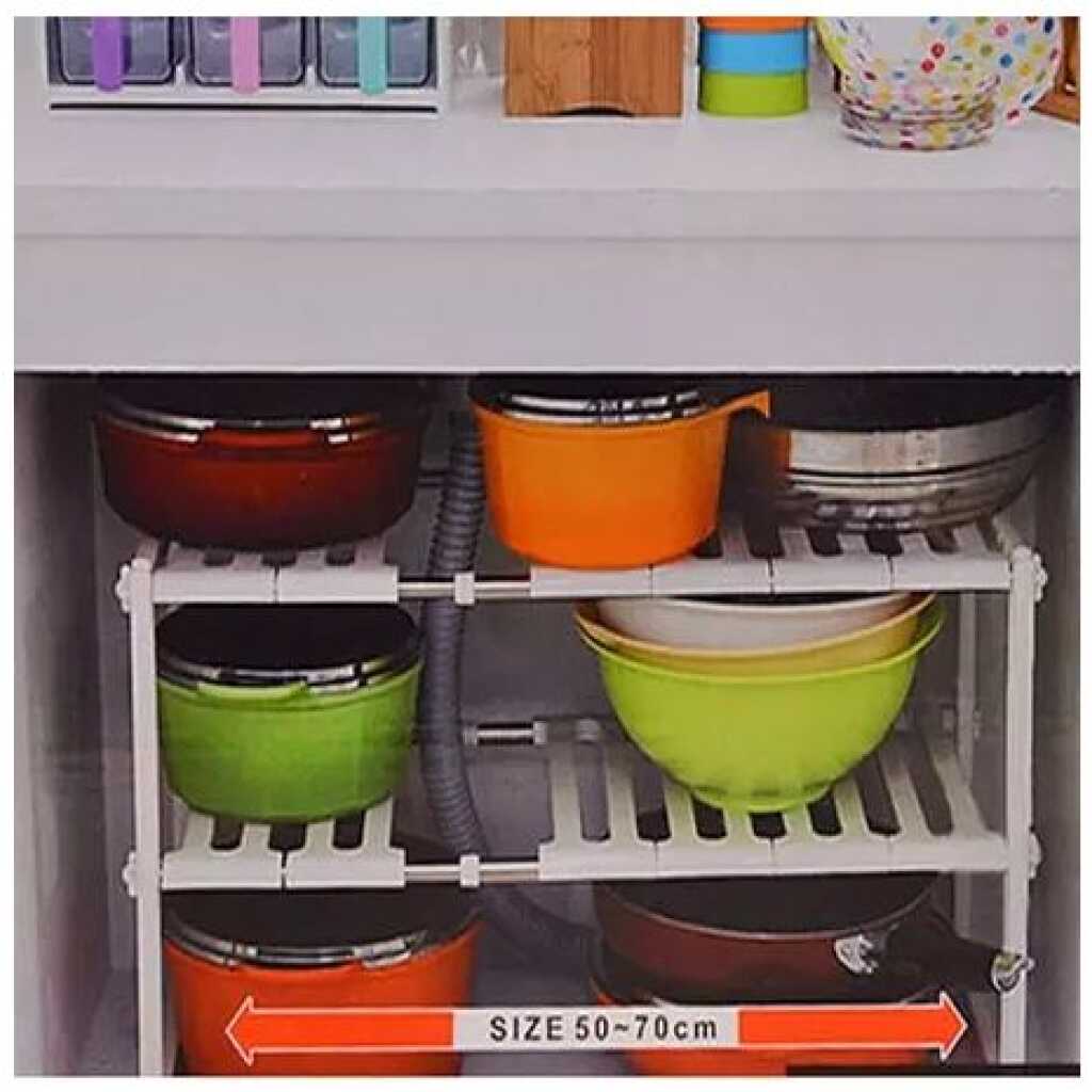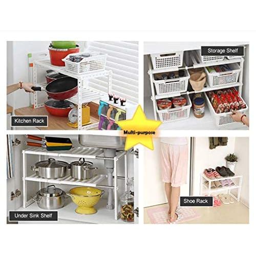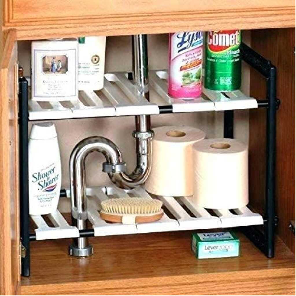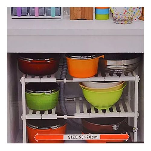 Adjustable Rack, Pool Space Arrangement Frame, Under-Sink Storage Shelves. Extendable Under Sink Rack (White) More often than not, we find it difficult to keep the space under our sink organized. This Expandable Under sink Storage Shelf Organizer Space Saver solution is suitable for almost any under-sink area. The adjustable shelves may be snapped on or off, to allow for building around the pipes. It is a good idea for saving space in the kitchen. A Home For All Your Under-Sink Items The unique one-of-a-kind under-sink organizer creates usable storage space. Solid metal piping and durable plastic shelves are modular and can be arranged to fit around any under-sink pipe configuration adding desirable shelf space! Easy to install, no tools needed. Finally have room for all your cleaning supplies and toiletries. This Sink Rack can be extended from 37cm to 66cm in length. The rack can be extended to hold more items Easy installation Removable parts for easy cleaning or easy storage
