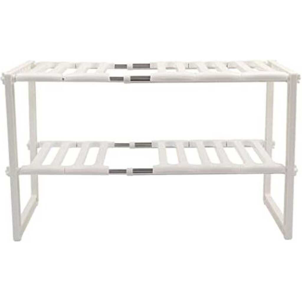 Key Features: Adjustable Rack, Pool Space Arrangement Frame, Under-Sink Storage Shelves. The rack can be extended to hold more items. Easy installation. Removable parts for easy cleaning or easy storage. Product Name: Adjustable Kitchen Rack (Pool Space Arrangements Frame). Applicable Space: Kitchen, Bathroom, Bedroom. Installation Type: Floor, free-standing. No. of Tiers: 2. Material: ABS Plastic, Stainless Steel. W x H: 26 x 37.5cm. Length Range: 50 to 70cm. Colour: White Box Contents. 2 x Extendable stainless steel poles. 2 x Plastic Rack tier. 2 x Plastic stand frame. 8 x Plastic fastener caps.