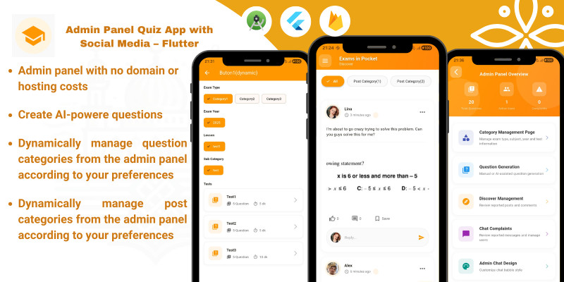 Admin Panel Quiz App with Social Media – Flutter. AI-powered exam & social learning app with dynamic categories, question generation, chat, and admin panel.