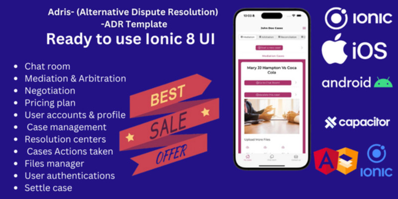 Adris - Ionic 8 . ADRIS- Alternative dispute resolution is an ionic 8, angular 19 capacitor 7 template. The app has in bult; Chat room ,Pricing plan