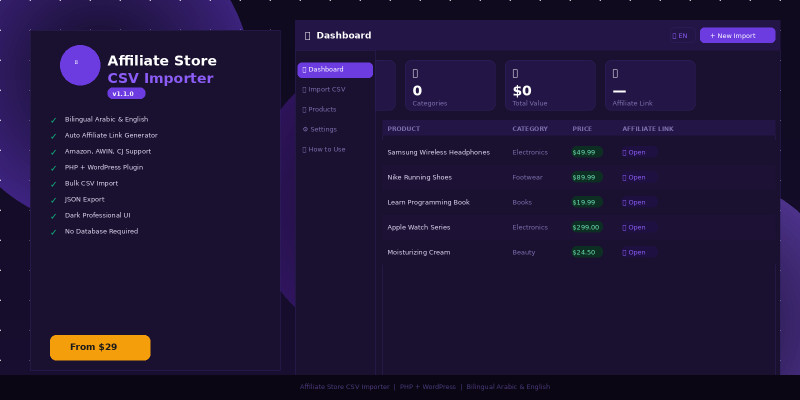 Affiliate Store CSV Importer - PHP And WordPress. Import affiliate products from CSV automatically. Auto-generates affiliate links. Bilingual English& Arabic. PHP + WordPress