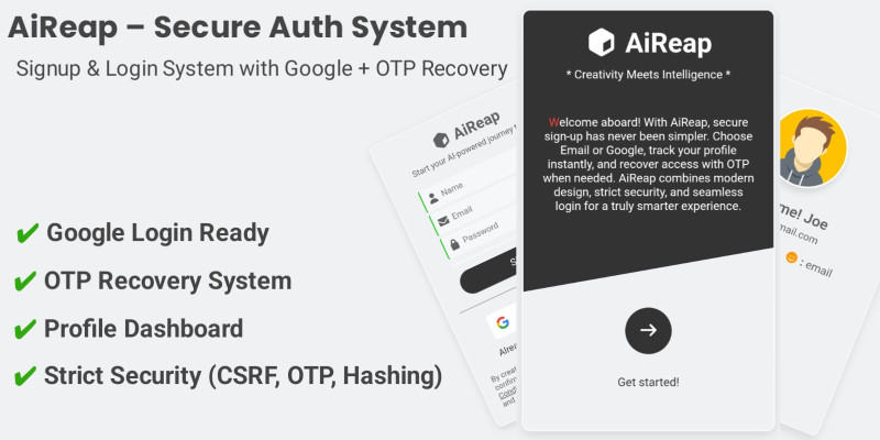 Aireap – Secure PHP User Auth System with OTP . Aireap is a secure PHP login and registration system with OTP, Google login, CSRF protection, and email verification support.