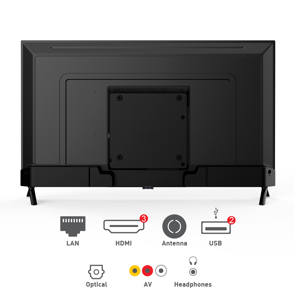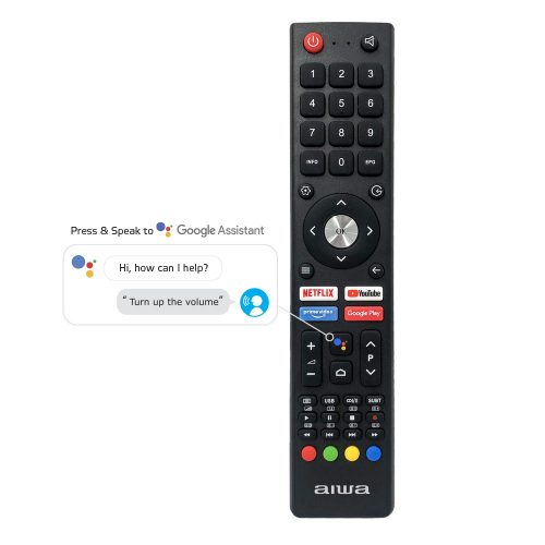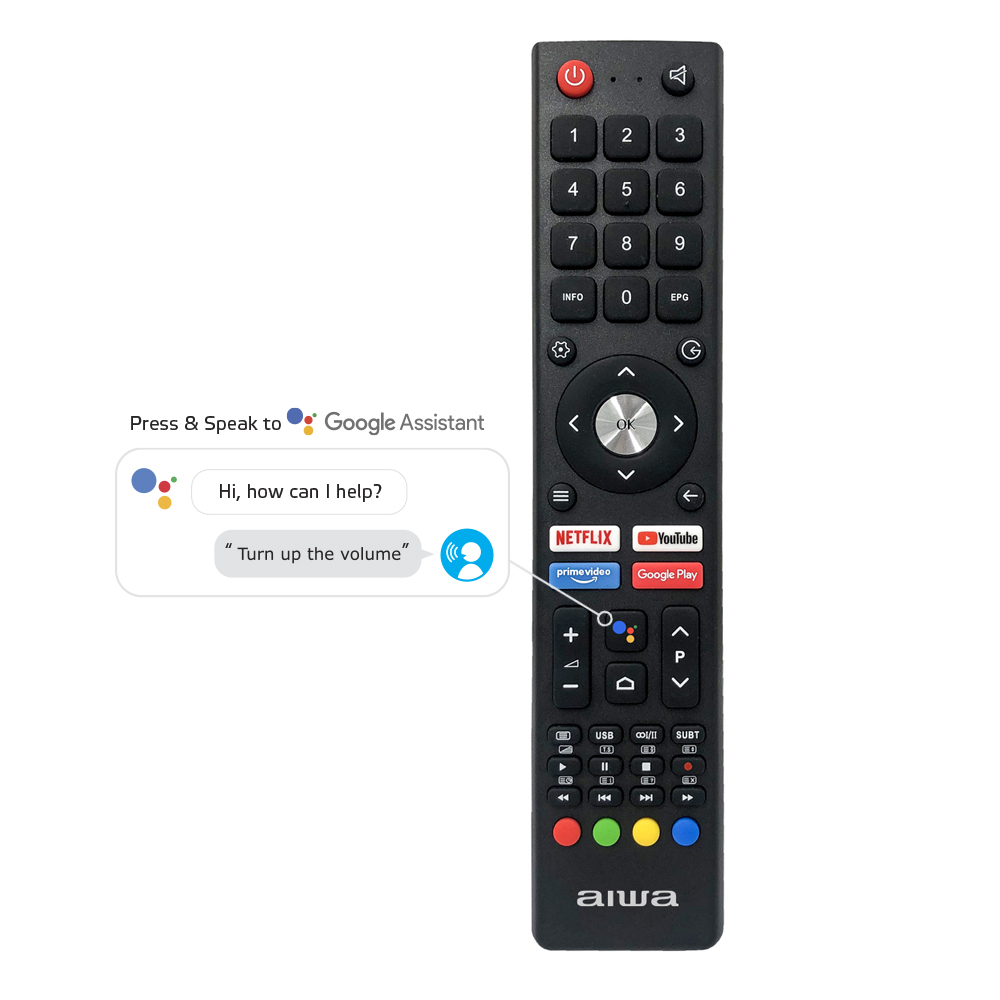 Aiwa 43-Inch HD LED Android Smart TV, HDMI, USB, Netflix, Youtube, Prime Video, Inbuilt Free To Air Decoder – Black. Resolution: Full HD 1920 x 1080 Contrast Ratio: 5000:1 Brightness: 220cd/m² Unit size: 897.9 x 180.2 x 560.2mm GB dimensions: 1025 x 135 x 635mm Gross Weight: 8.1kg; Net weight: 6.0kg * USB memory device not included Key Features: Aiwa 43-Inch HD LED Android Smart TV, HDMI, USB, Netflix, Youtube, Prime Video, Inbuilt Free To Air Decoder – Black. Android TV with Quadcore processor Bluetooth remote with Google Assistant and voice commands Ultra-thin bezels Built-in Chromecast Shortcut media streaming buttons on remote control Download your favourite apps from Google Play PVR recording to USB* Connectivity: RJ45 input, 3x HDMI inputs (one with ARC), 2x USB inputs, mini composite (AV) input, optical audio output, headphone out