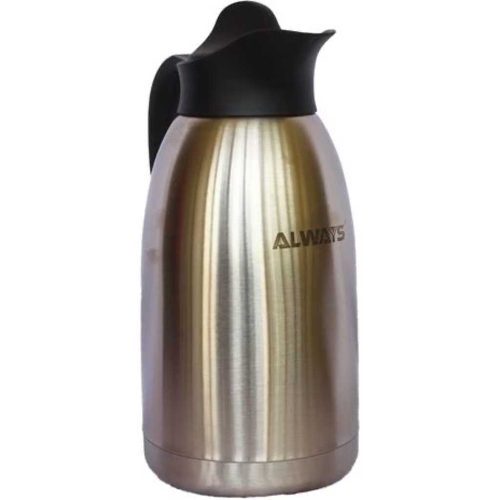 one touch lid provides sinle-hand operation and is food safe.the twin-walled stainless steel arshia thoughened creates a vacuumbetween the walls, allowing neither heat nor cold to escape.the body of the flask is comprised of high-quality stainless steel raw materials.the seal prevents the escape of radiant heat.24 hrs cold24 hrs hot