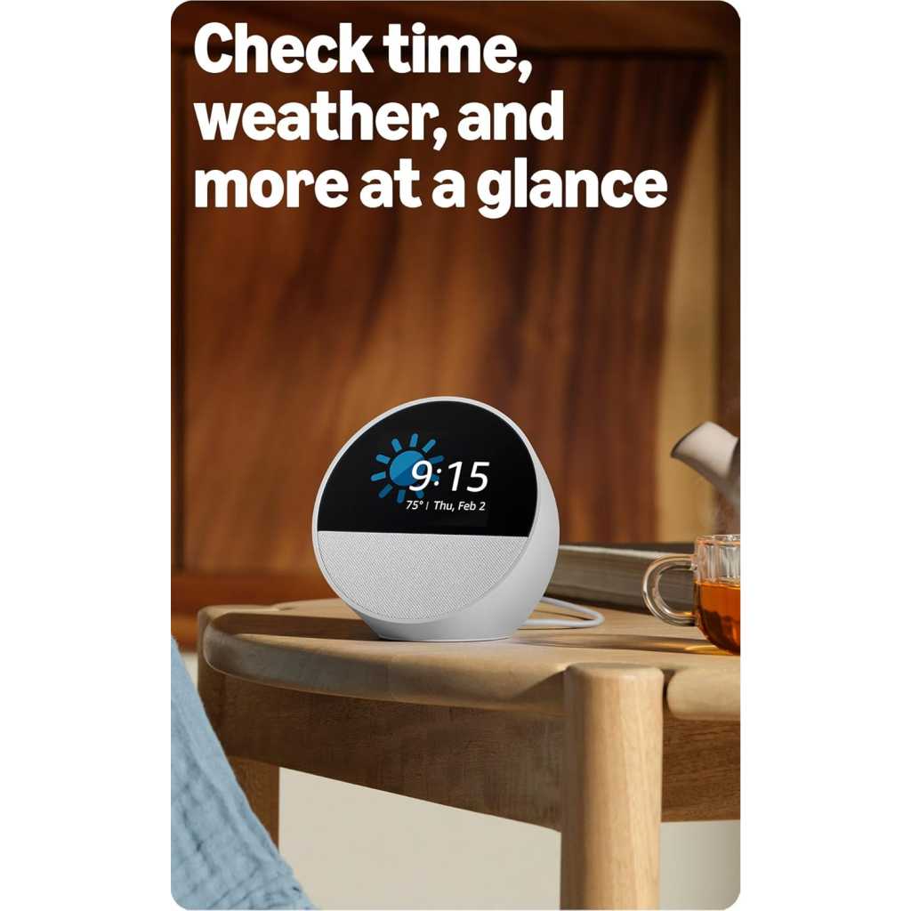 Key Features: MEET ECHO SPOT – A sleek smart alarm clock with Alexa and big vibrant sound. Ready to help you wake up, wind down, and so much more. CUSTOMIZABLE SMART CLOCK – See time, weather, and song titles at a glance, control smart home devices, and more. Personalize your display with your favorite clock face and fun colors. BIG VIBRANT SOUND – Enjoy rich sound with clear vocals and deep bass. Just ask Alexa to play music, podcasts, and audiobooks. See song titles and touch to control your music. EASE INTO THE DAY – Set up an Alexa routine that gently wakes you with music and gradual light. Glance at the time, check reminders, or ask Alexa for weather updates. KEEP YOUR HOME COMFORTABLE – Control compatible smart home devices. Just ask Alexa to turn on lights or touch the screen to dim. Create routines that use motion detection to turn down the thermostat as you head out or open the blinds when you walk into a room. MUSIC, ALEXA, AND NOW WIFI – Extend your wifi coverage and say goodbye to drop-offs and buffering with eero Built-in on a compatible eero wifi network. DESIGNED TO PROTECT YOUR PRIVACY – Amazon is not in the business of selling your personal information to others. Built with multiple layers of privacy controls including a mic off button and in-app controls DESIGNED FOR SUSTAINABILITY – This device is made from 36% recycled materials.