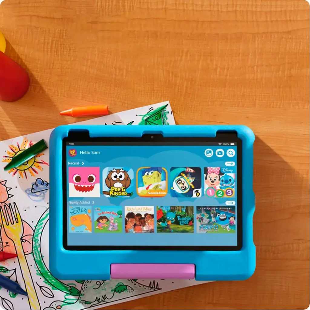 A fully featured tablet (not a toy) with a wide, 10.1″ 1080p Full HD display for kids ages 3-7 includes comprehensive parental controls, 1 year of Amazon Kids+, a kid-proof case, and a 2-year worry-free guarantee.