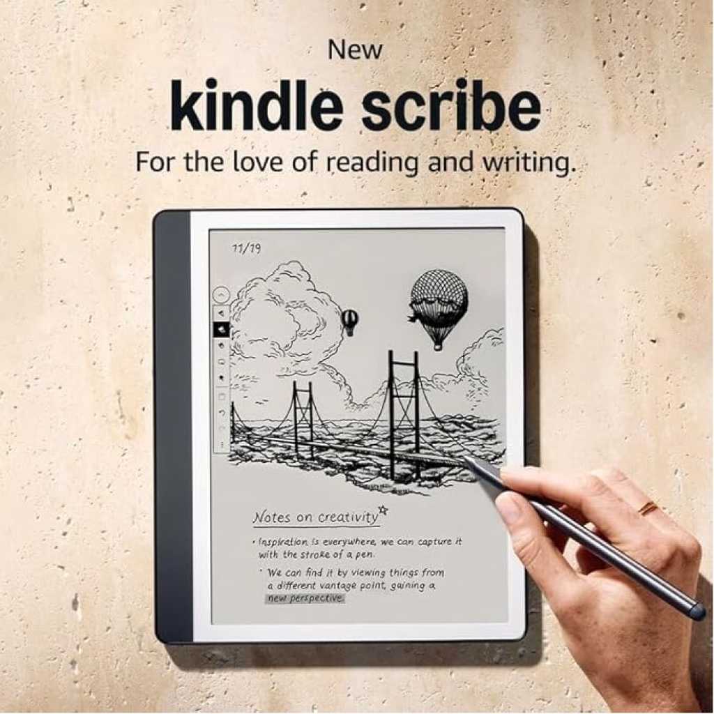 Kindle Scribe The Kindle Scribe (1st Generation – 2024) is Amazon’s ultimate reading and writing device, blending the superior Paperwhite display with premium note-taking features. Its 10.2” 300 ppi screen ensures a sharp and glare-free experience, while the Premium Pen allows effortless annotation and sketching. Designed with storage options up to 64 GB, long-lasting battery life, and advanced accessibility features, the Kindle Scribe elevates both productivity and leisure. Specifications Display 10.2” Paperwhite display technology with built-in light, 300 ppi, optimized font technology, 16-level grayscale Size Device: 7.7” x 9.0 x 0.22” (196 x 230 x 5.7 mm) Premium Pen: 6.4” x 0.35” x 0.33” (162 x 8.8 x 8.4 mm) On-Device Storage 32 GB Weight Device: 15.3 oz (433 g) Premium Pen: 0.60 oz (17 g) Wi-Fi Connectivity Supports 2.4 GHz and 5.0 GHz networks with WEP, WPA, WPA2, WPA3 security Not compatible with ad-hoc (peer-to-peer) Wi-Fi Content Formats Supported Kindle Format 8 (AZW3), Kindle (AZW), TXT, PDF, unprotected MOBI, PRC natively PDF, DOCX, DOC, HTML, EPUB, TXT, RTF, JPEG, GIF, PNG, BMP (through conversion) Audible audio format (AAX) Accessibility Features VoiceView screen reader over Bluetooth audio (text-to-speech) Invert black/white, font size, font face, line spacing, and margin adjustments Battery Life Reading: Up to 12 weeks (30 minutes/day, wireless off, light at 13) Writing: Up to 3 weeks (30 minutes/day, wireless off, light at 13) Charge Time ~7 hours via USB-C (computer) ~2.5 hours with 9W USB-C adapter Included in the Box Kindle Scribe, Premium Pen, USB-C charging cable, 5 replacement tips, tip replacement tool, built-in rechargeable battery Color Options Tungsten, Metallic Jade Generation 1st generation, 2024 release