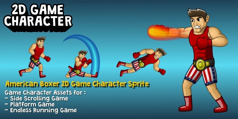 American Boxer 2D Game Character Sprite. Best assets for game like: Shooting game, Running Game,Platform Game, and more side Scrolling games.​
