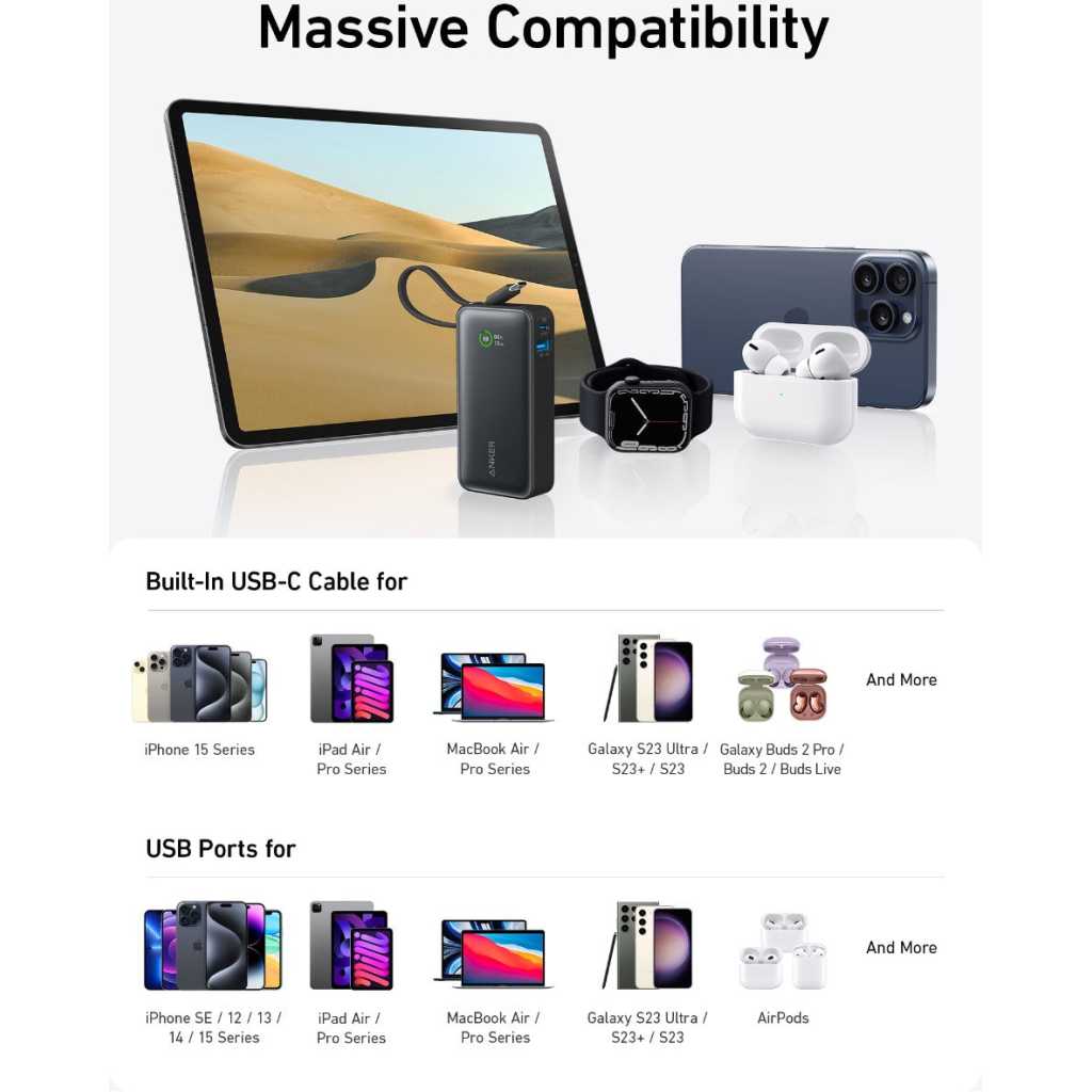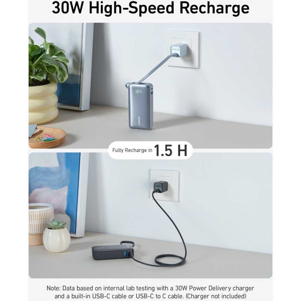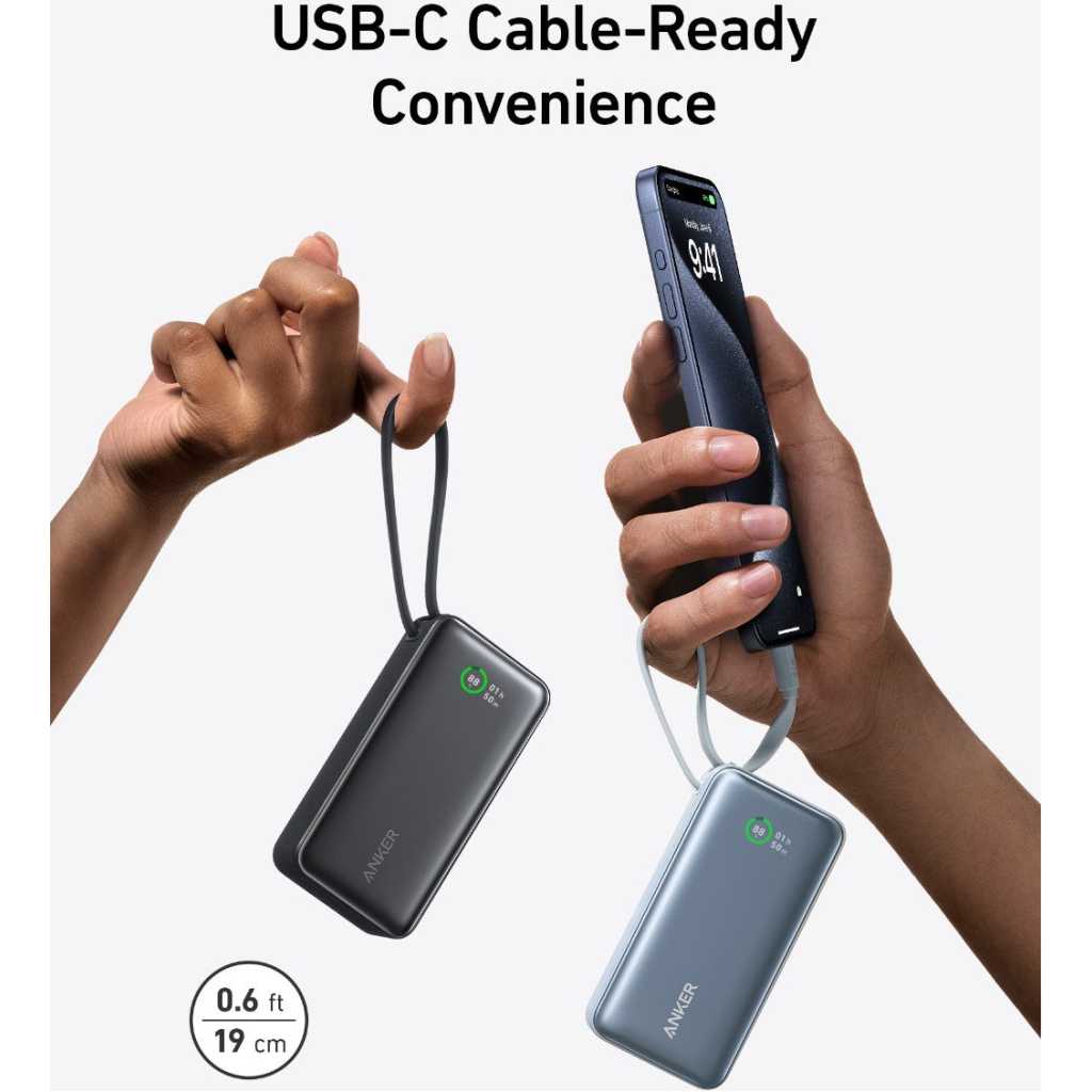 Key Features: Built-In USB-C Cable: Use the integrated USB-C cable to charge your phones, tablets, and laptops, as well as recharge the power bank, meeting all your charging needs. 30W Bi-Directional Charging: Boost the power bank to 50% in just 45 minutes and fully recharge in 1.5 hours, or charge your iPhone 14 to 50% within 30 minutes through 30W two-way fast charging. 10,000mAh Worry-Free Power: Experience hassle-free power on the go with the built-in USB-C cable, providing seamless charging in a compact form factor measuring 4.09 × 2.06 × 1.02 inches. A Greener Approach: Through meticulous material selections and manufacturing practices, the exterior casing is made from 80% post-consumer recycled plastic (PCR) to reduce carbon emissions. What You Get: Anker Nano Power Bank (30W, Built-In USB-C Cable), welcome guide, our worry-free 24-month warranty, and friendly customer service.