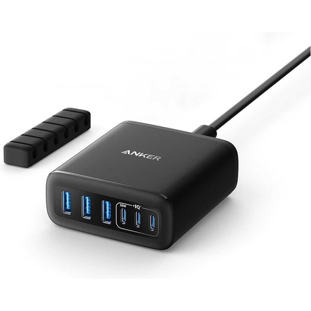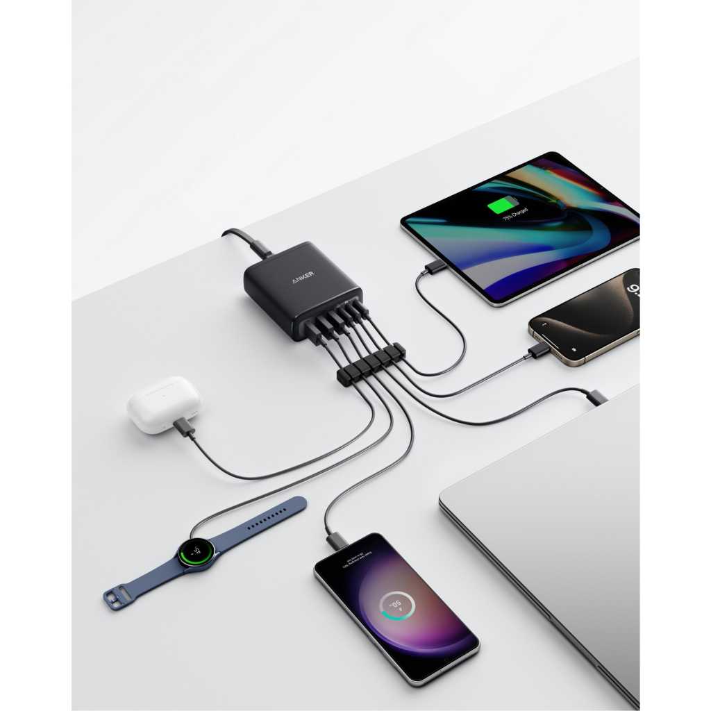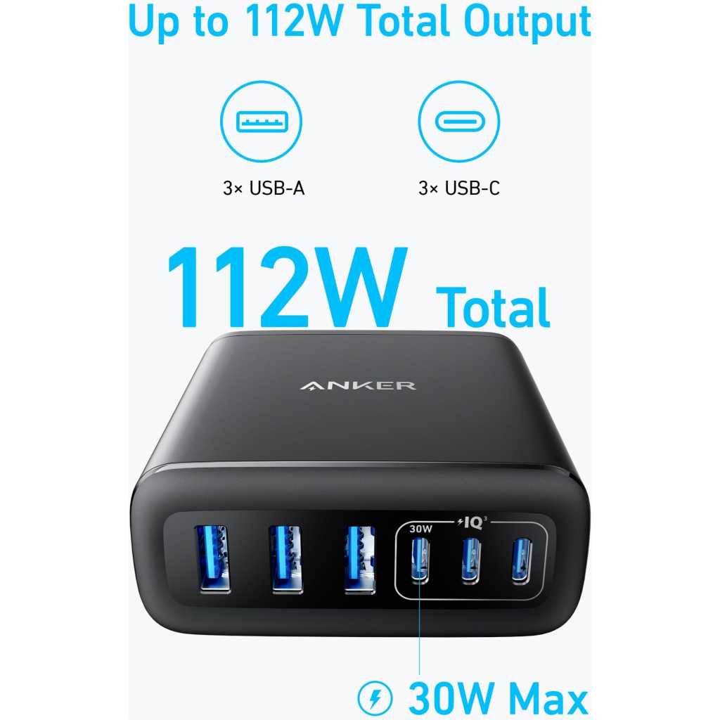 Key Features: 6-in-1 Charger for All: Designed for modern needs, this charger can power your entire digital lineup, from laptops to smartphones, all at the same time. Note: 30W charging is limited to the USB-C1 port for MacBook Air. Maximum Power, Minimum Time: Efficiently power your MacBook Air to 50% in just 1 hour 40 minutes or quickly boost your iPhone 16 Pro Max from 0 – 50% in 30 minutes with a single 30W max charging port. 112W Multi-Device Charger: Equipped with 3 USB-C and 3 USB-A ports, this charger offers a total output of 112W, making it powerful enough to charge a range of devices. Tidy Desk, Tidy Mind: Say goodbye to tangled wires and cluttered desks. Included with the charger is a silicone cable organizer, ensuring your workspace remains orderly and stress-free. What You Get: Anker Charger (112W, 6 Ports), cable organizer, welcome guide, 18-month warranty, and our friendly customer service.