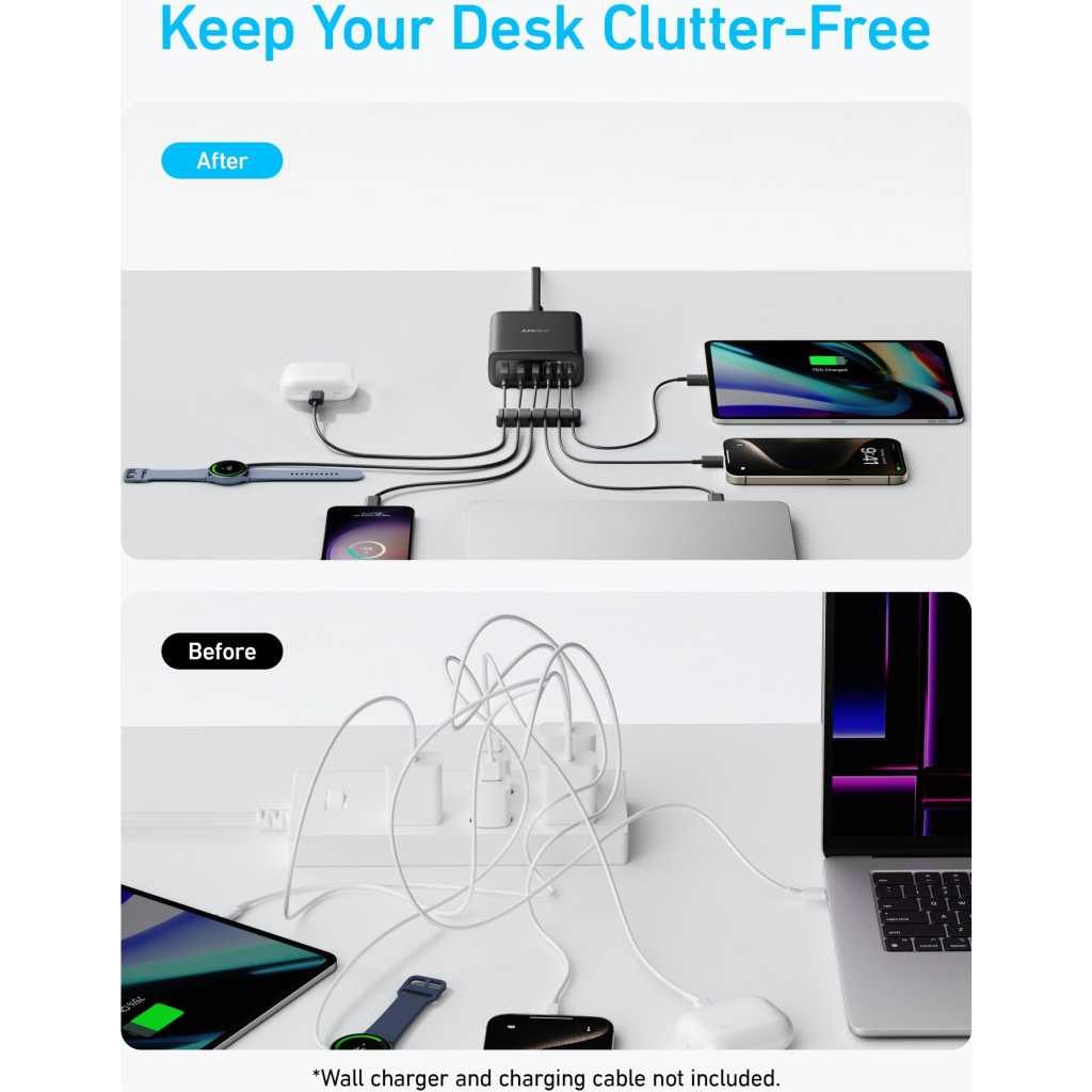 6-in-1 Charger for All: Designed for modern needs, this charger can power your entire digital lineup, from laptops to smartphones, all at the same time. Note: 30W charging is limited to the USB-C1 port for MacBook Air. Maximum Power, Minimum Time: Efficiently power your MacBook Air to 50% in just 1 hour 40 minutes or quickly boost your iPhone 16 Pro Max from 0 – 50% in 30 minutes with a single 30W max charging port. 112W Multi-Device Charger: Equipped with 3 USB-C and 3 USB-A ports, this charger offers a total output of 112W, making it powerful enough to charge a range of devices. Tidy Desk, Tidy Mind: Say goodbye to tangled wires and cluttered desks. Included with the charger is a silicone cable organizer, ensuring your workspace remains orderly and stress-free. What You Get: Anker Charger (112W, 6 Ports), cable organizer, welcome guide, 18-month warranty, and our friendly customer service.