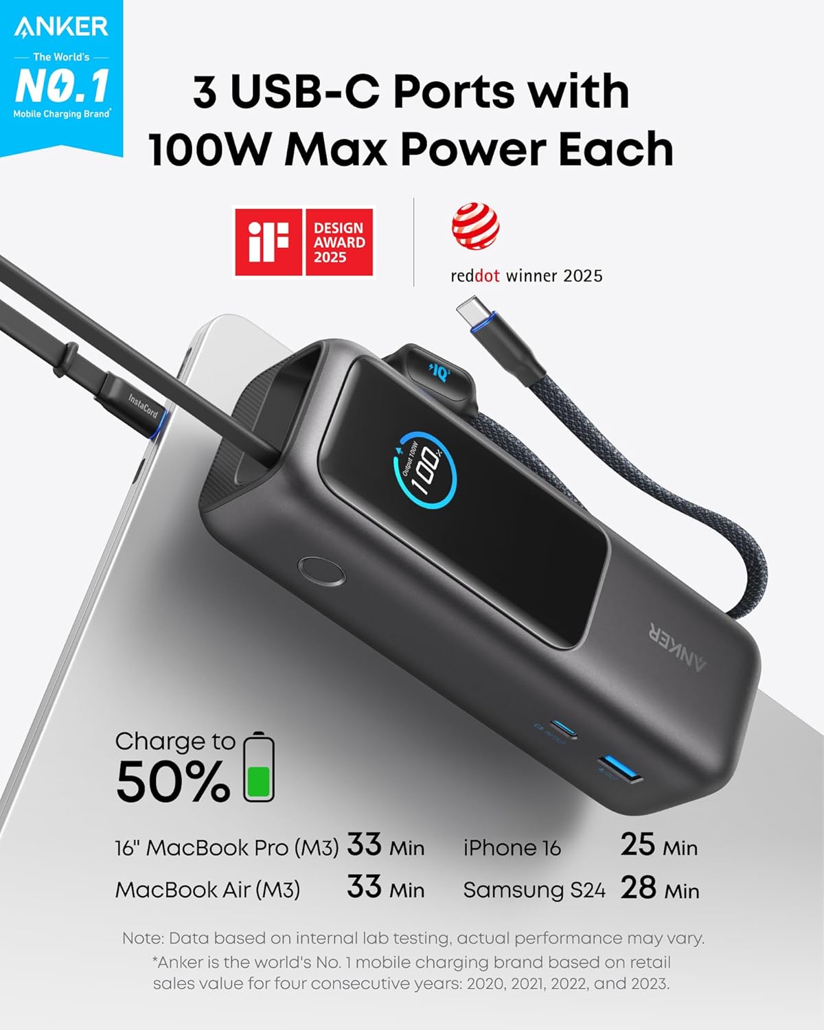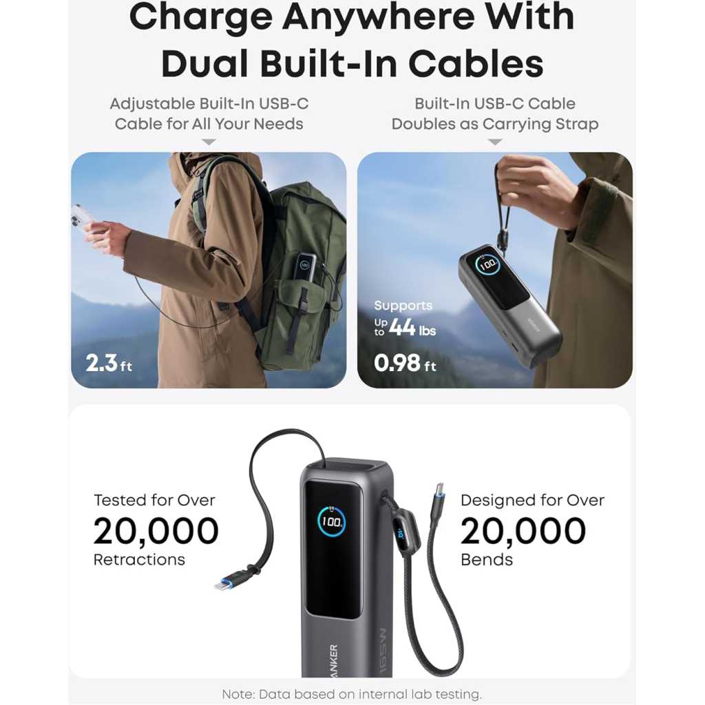 Efficient 165W Dual Laptop Charging: Streamline your charging with dual ports that offer up to 165W, capable of powering two laptops quickly to keep up with your demands. Each port delivers up to 100W, so enjoy efficient charging without compromising on speed. 25,000mAh for Long-Haul Power: Set off on extended journeys with a huge 25,000mAh capacity that supports your devices through multiple uses, complete with 100W ultra-fast recharging that fuels the power bank to 30% in just 20 minutes. Dual Built-In Cables for On-the-Go Use: Enjoy the convenience of two built-in USB-C cables, retractable to 2.3 ft and doubling as a robust carrying strap. They are designed to endure over 17,000 bends and support up to 44 lbs. Charge 4 Devices at Once: Never run out of power, whether you’re charging smartphones, tablets, or other USB-enabled devices. Connect up to four at once thanks to dual USB-C Cables, a USB-A port, and a USB-C port. What You Get: Anker Power Bank (25K, 165W, Built-In and Retractable Cables), welcome guide, 12-month warranty, and our friendly customer service.
